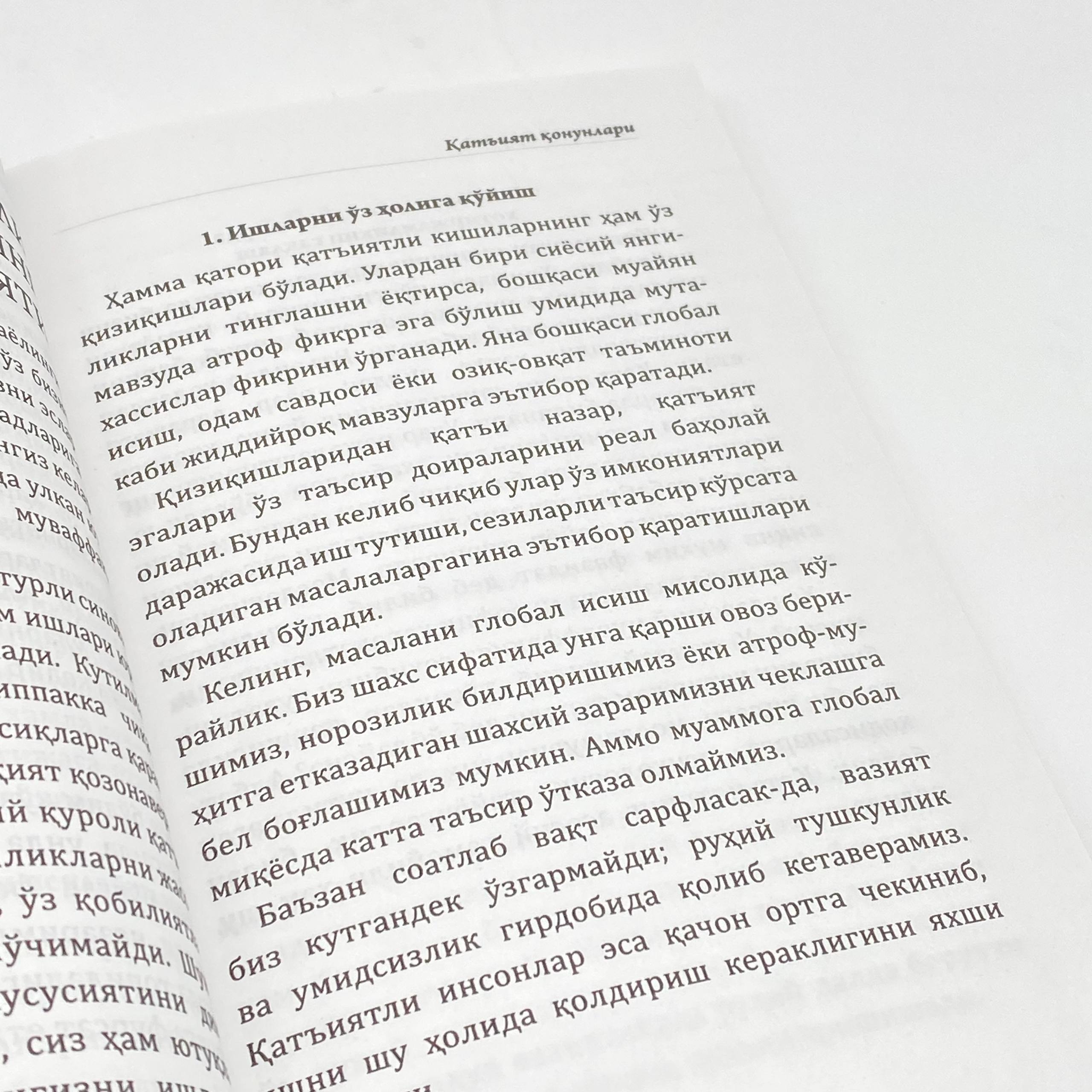 📘 “Qat'iyat qonunlari” — bu o‘zini sinovlar orasida yo‘qotmaganlar uchun yozilgan asar. Har safar yiqilganda qayta turishni o‘rgatadi, va eng muhimi — nima bo‘lgan taqdirda ham o‘zingizga sodiq qolishni eslatadi.