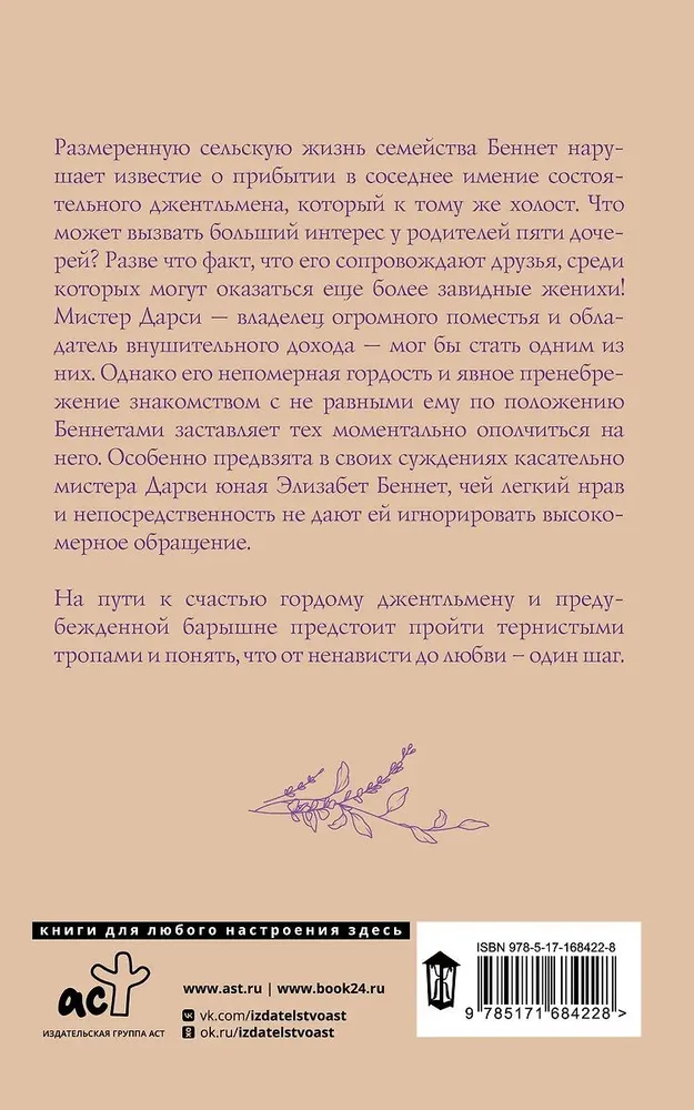 Культовый роман Джейн Остен был неоднократно экранизирован и входит в списки величайших книг всех времен. Что делает историю отношений умной и гордой Элизабет Беннет и не менее гордого мистера Дарси столь популярной? Англия, конец XVIII века. Родители пятерых сестер Беннет озабочены тем, чтобы удачно выдать дочерей замуж. Размеренная жизнь семейства переворачивается вверх дном, когда по соседству появляется молодой джентльмен — мистер Бингли. Среди друзей нового соседа оказывается немало утонченных аристократов, которые не прочь поухаживать за очаровательными сестрами. Своевольная Элизабет знакомится с красивым и высокомерным мистером Дарси. Между ними разгорается нешуточное противостояние, результатом которого может стать как любовь, так и ненависть. Смогут ли они преодолеть все разногласия и недоразумения? И все-таки что же вот уже несколько веков заставляет читателей смеяться и плакать, трепетать от гнева и радоваться? На первый взгляд, «Гордость и предубеждение» — любовный роман. Однако это и веселая комедия, и история взросления, и социальная критика, и философская притча. Роман чрезвычайно остроумен. Тонкий юмор и изящный стиль изложения не позволяют ему утратить своего неподражаемого очарования и блеска. Многочисленные драматические повороты совершенно не дают оторваться от чтения. К тому же каждая страница пропитана духом Англии. С невероятной иронией и удивительной наблюдательностью Джейн Остен описывает быт провинциального общества, особенности этикета и манер. С большим мастерством подлинного художника она раскрывает душевую жизнь героев, вглядывается в причины и побуждения. Следить за тем, как меняется персонаж под влиянием тех или иных событий, невероятно увлекательно.