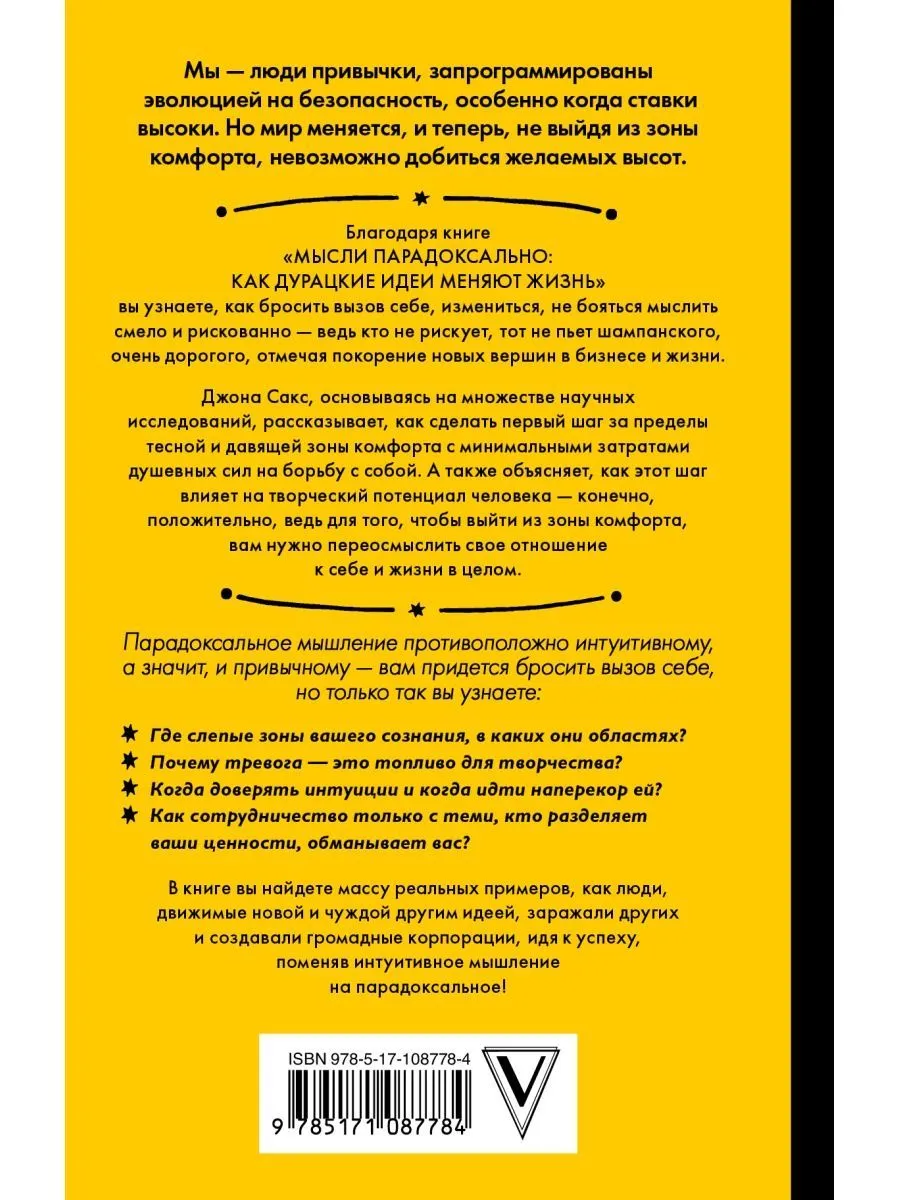 Мы люди привычки, запрограммированы эволюцией на безопасность, особенно когда ставки высоки. Но мир меняется, и теперь, не выйдя из зоны комфорта, невозможно добиться желаемых высот.Благодаря книге МЫСЛИ ПАРАДОКСАЛЬНО: КАК ДУРАЦКИЕ ИДЕИ МЕНЯЮТ ЖИЗНЬ вы узнаете, как бросить вызов себе, измениться, не бояться мыслить смело и рискованно ведь кто не рискует, тот не пьет шампанского, очень дорогого, отмечая покорение новых вершин в бизнесе и жизни.Джона Сакс, основываясь на множестве научных исследований, рассказывает, как сделать первый шаг за пределы тесной и давящей зоны комфорта с минимальными затратами душевных сил на борьбу с собой. А также объясняет, как этот шаг влияет на творческий потенциал человека конечно, положительно, ведь для того, чтобы выйти из зоны комфорта, вам нужно переосмыслить свое отношение к себе и жизни в целом.Парадоксальное мышление противоположно интуитивному, а значит, и привычному вам придется бросить вызов себе, но только так вы узнаете:- Где слепые зоны вашего сознания, в каких они областях?- Почему тревога это топливо для творчества?- Когда доверять интуиции и когда идти наперекор ей?- Как сотрудничество только с теми, кто разделяет ваши ценности, обманывает вас?В книге вы найдете массу реальных примеров, как люди, движимые новой и чуждой другим идеей, заражали других и создавали громадные корпорации, идя к успеху, поменяв интуитивное мышление на парадоксальное!