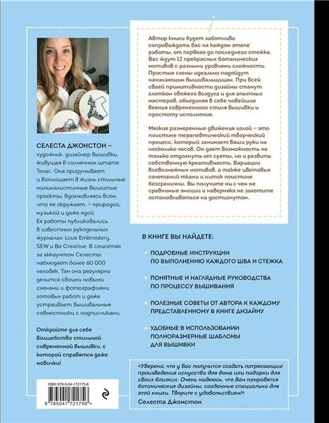 Вышивка — это не только любимое хобби, но и самая настоящая терапия для современного человека? Мягкие размеренные движения иглой — это поистине терапевтический творческий процесс, который занимает ваши руки на несколько часов. Вариации всевозможных мотивов, цветовых сочетаний ткани и ниток поистине безграничны. Процесс создания вышивки подарит незабываемое ощущение эйфории. В скором времени вы обнаружите, что всегда найдутся новые стежки для изучения и новые навыки, которые потребуется усовершенствовать по мере вашей готовности. И поверьте, попробовав вышивать единожды, вы уже не захотите останавливаться на достигнутом. Автор книги будет заботливо сопровождать вас на каждом этапе работы, от первого и до последнего стежка. Внутри вас ждут 12 прекрасных ботанических дизайнов разных уровней сложности. Простые схемы идеально подойдут начинающим вышивальщицам. При всей своей примитивности, дизайны станут глотком свежего воздуха и для опытных мастеров, объединяя в себя новейшие веяния современного стиля вышивки и простоту исполнения. • Подробные инструкции по выполнению каждого шва и стежка. • Понятные руководства для наглядной иллюстрации процесса вышивания. • Полезные советы от автора к каждому представленному в книге дизайну. • Удобные в использовании полноразмерные шаблоны для вышивки. Наслаждайтесь расслабляющим творческим процессом вышивки с современными и вдохновляющими дизайнами!