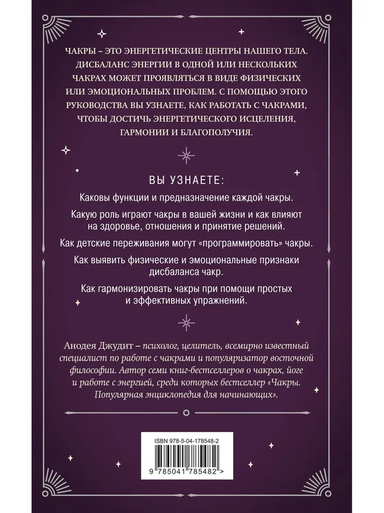Книга всемирно известного специалиста по работе с чакрами Анодеи Джудит включает полную и полезную информацию о системе чакр и рассказывает, как работать с ними, чтобы исцелиться от болезней и достичь гармонии и благополучия. ВЫ УЗНАЕТЕ: • Каковы функции и предназначение каждой чакры. • Какую роль играют чакры в вашей жизни и как влияют на здоровье, отношения и принятие решений. • Как детские переживания могут "программировать" чакры. • Как выявить физические, эмоциональные и умственные признаки дисбаланса чакр. • Как гармонизировать чакры при помощи простых и эффективных упражнений. • Как использовать чакры для самовыражения, освобождения и достижения положительных изменений в вашей жизни .и многое другое! Анодея Джудит — психолог, целитель, всемирно известный специалист по работе с чакрами и популяризатор восточной философии. Автор семи книг-бестселлеров о чакрах, йоге и работе с энергией, среди которых бестселлер "Чакры. Популярная энциклопедия для начинающих". Анодея Джудит читает лекции и ведет семинары по всему миру.