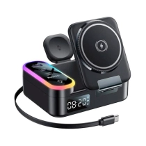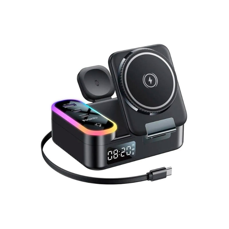 3‑in‑1 simsiz zaryadlash stantsiyasi soat va RGB yoritgich bilan birlashtirib, zamonaviylik va funksionallikni ta’minlaydi. U telefon, aqlli soatlar va naushniklarni bir vaqtda zaryadlash imkonini beradi.