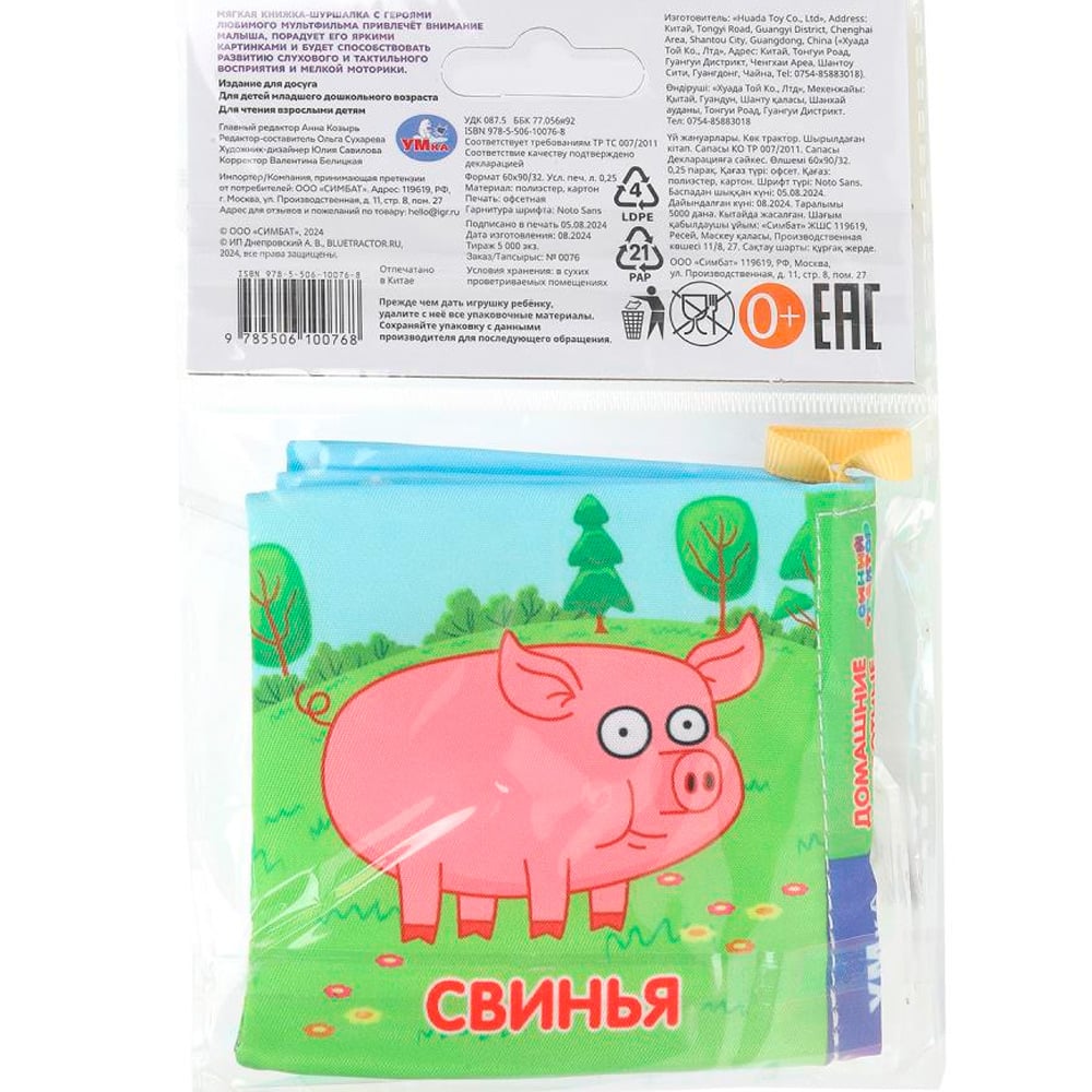 Книга Умка 9785506100768 «Домашние животные. Синий Трактор. Книжка-шуршалка» (арт. 397914) — развивающая мягкая книжка для малышей с яркими иллюстрациями домашних животных и героями из серии "Синий Трактор".