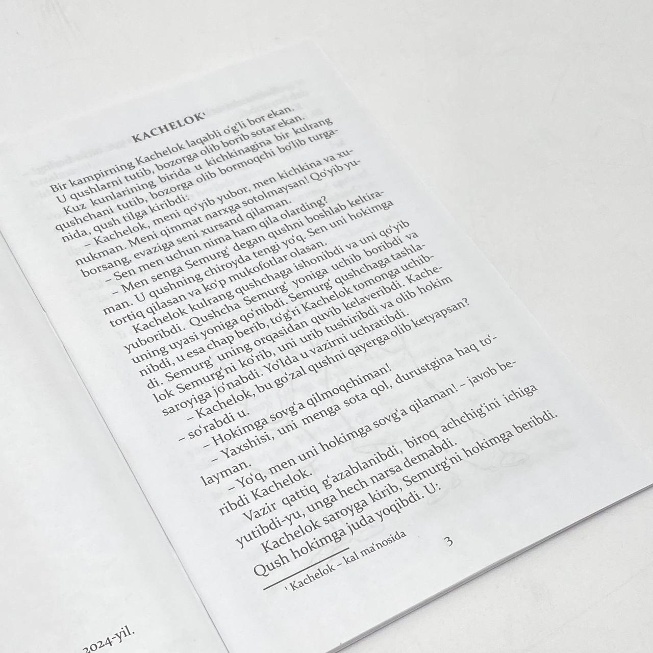 Ishlab chiqaruvchidan 1 yil kafolat. Mahsulotni 10 kun ichida qabul qilamiz va darhol pulni qaytaramiz.Bir kampirning Kachelok laqabli o'g'li bor ekan. U qushlarni tutib, bozorga olib borib sotar ekan. Kuz kunlarining birida u kichkinagina bir kulrang qushchani tutib, bozorga olib bormoqchi bo'lib turganida, qush tilga kiribdi: