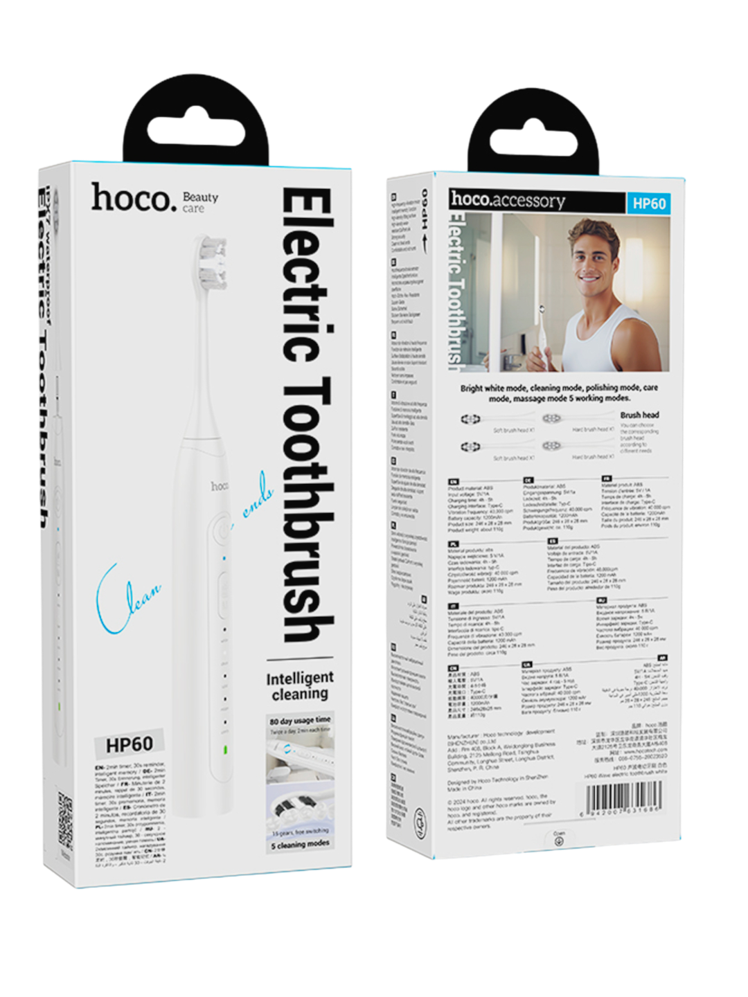 Hoco HP60 — zamonaviy elektr tish cho‘tkasi bo‘lib, og‘iz bo‘shlig‘ini samarali va chuqur tozalash uchun mo‘ljallangan. U kundalik tish parvarishini qulay va samarali qiladi.