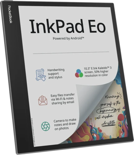 PocketBook 1042 InkPad Eo — bu rangli E-Ink Kaleido 3 ekranga ega, 10,3 dyuymli zamonaviy elektron kitob o‘qigichi. 1860×2480 pikselli (300 ppi) yuqori aniqlikdagi ekran ko‘zlar uchun qulay bo‘lib, nafaqat kitoblar, balki jurnallar va darsliklarni ham o‘qish uchun ajoyib.