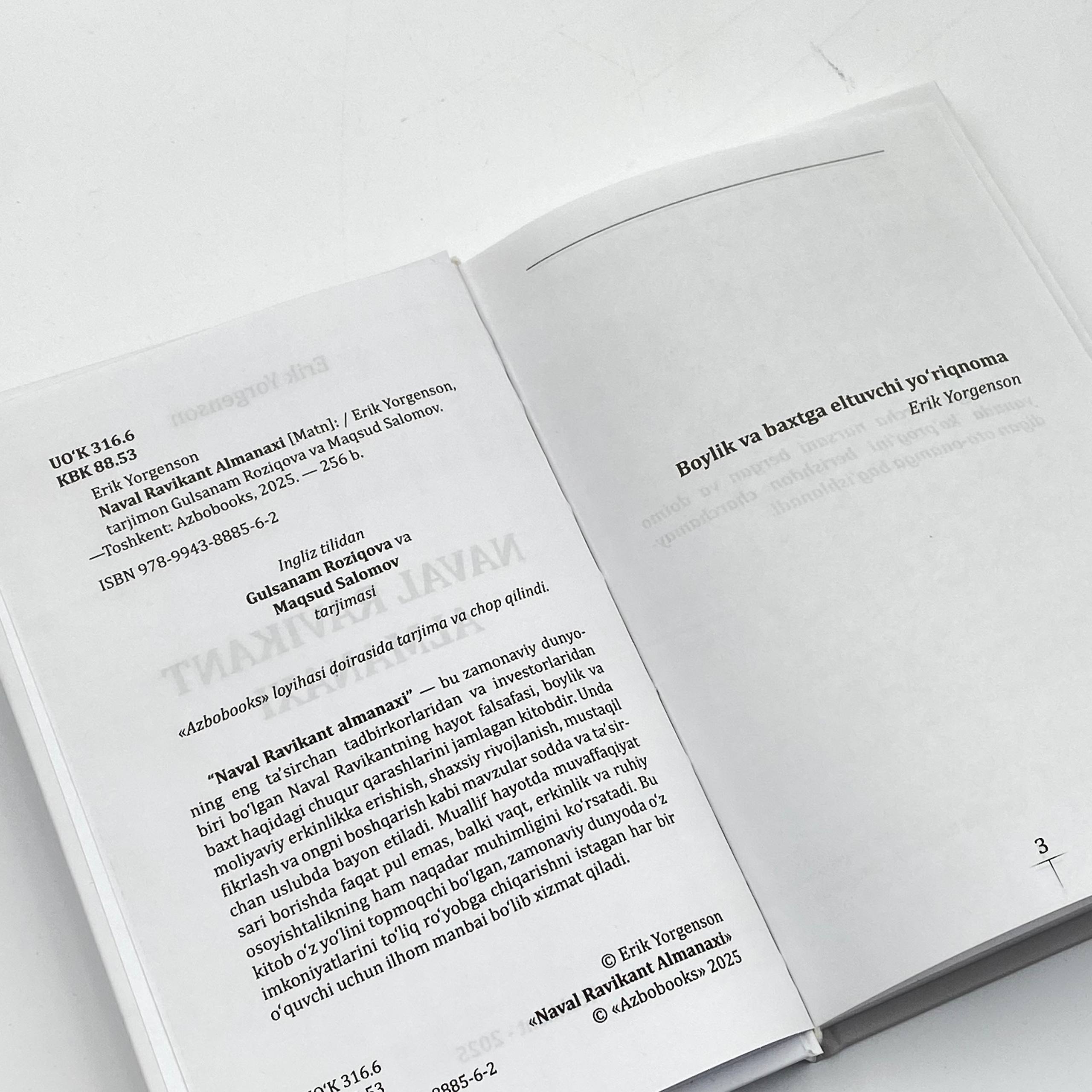 "Naval Ravikant almanaxi" — bu zamonaviy dunyoning eng ta'sirchan tadbirkorlaridan va investorlaridan biri bo'lgan Naval Ravikantning hayot falsafasi, boylik va baxt haqidagi chuqur qarashlarini jamlagan kitobdir. Unda moliyaviy erkinlikka erishish, shaxsiy rivojlanish, mustaqil fikrlash va ongni boshqarish kabi mavzular sodda va ta'sirchan uslubda bayon etiladi. Muallif hayotda muvaffaqiyat sari borishda faqat pul emas, balki vaqt, erkinlik va ruhiy osoyishtalikning ham naqadar muhimligini ko'rsatadi. Bu kitob o'z yo'lini topmoqchi bo'lgan, zamonaviy dunyoda o'z imkoniyatlarini to'liq ro'yobga chiqarishni istagan har bir o'quvchi uchun ilhom manbai bo'lib xizmat qiladi.
