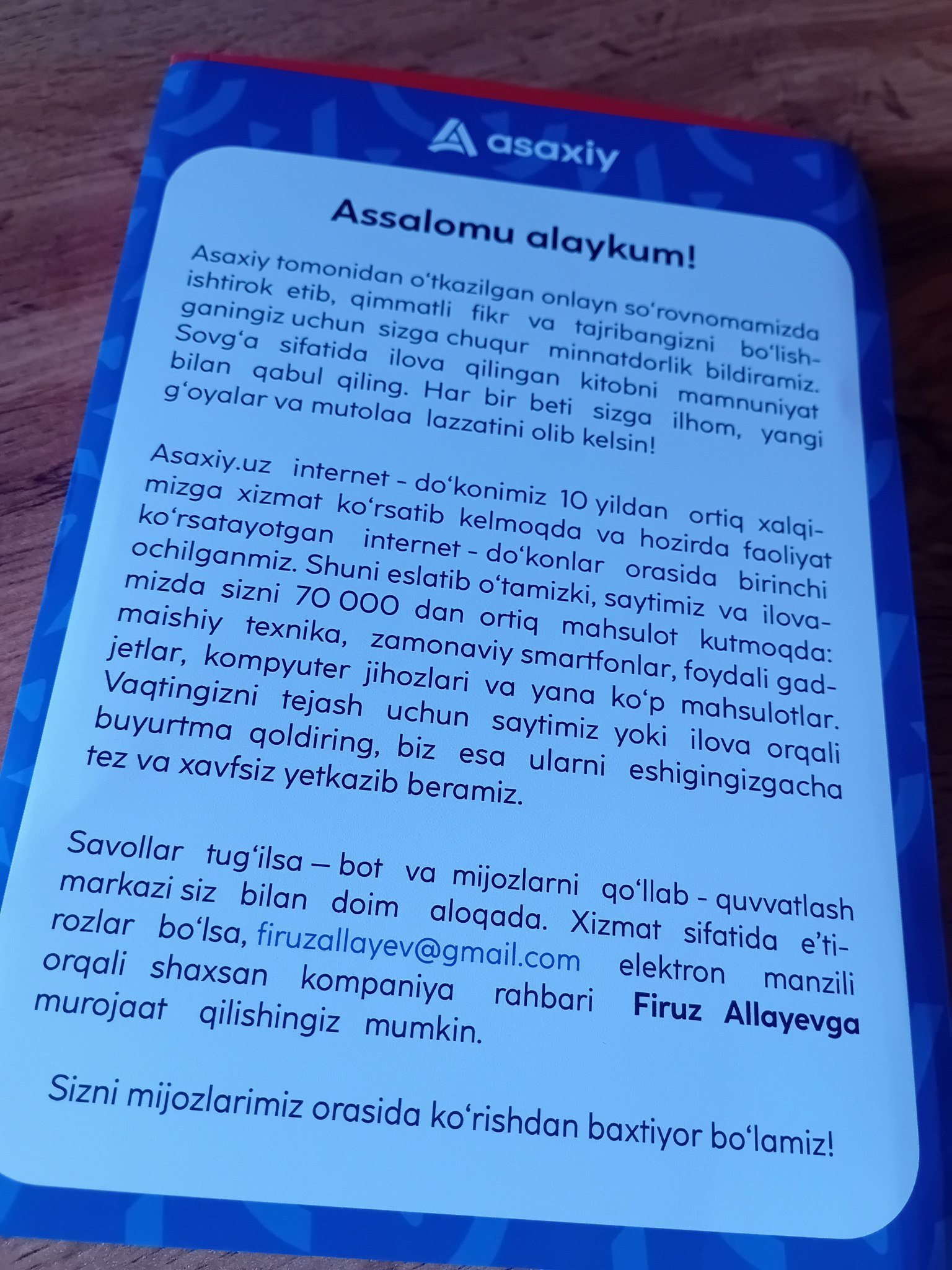 Assalomu alaykum avvalo hammangizga rahmat,boshida soʻrovnomani toʻldirayotganda toʻgʻrisi ishonmaganim,lekin kitob qoʻlimga yetib keld, Rahmat barchangizga....kitob sifati.... shunchaki vauvvvv ishlarizni rivojini bersin
