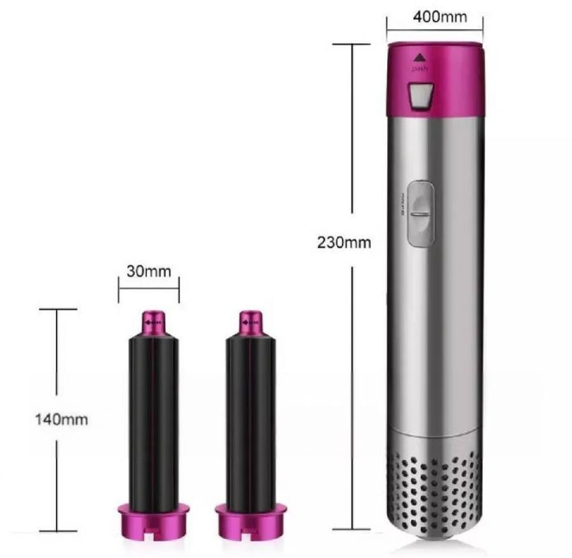 5 xil nasadka: hajm beruvchi dumaloq taroq, jingalak va to‘lqinlar uchun silindrsimon nasadkalar, silliqlash va itoatkor qilish uchun maxsus taroq.