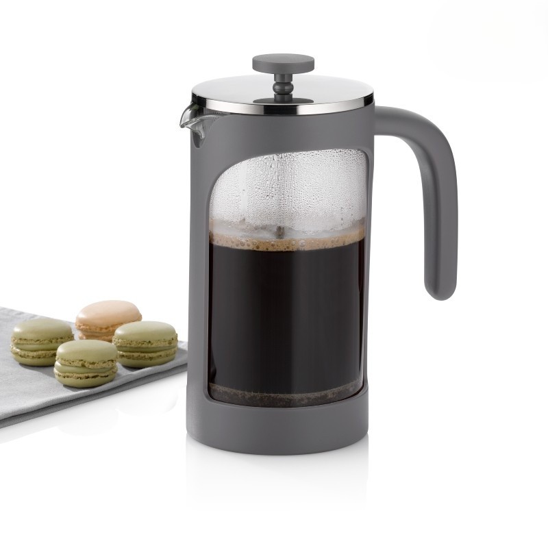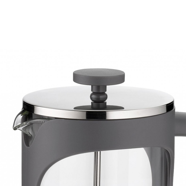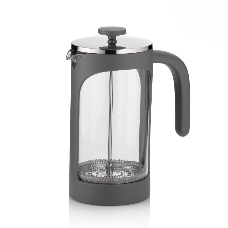 Kolba yuqori harorat va keskin harorat o‘zgarishlariga chidamli borosilikat shishadan tayyorlangan. Korpus va tutqich mustahkam kulrang plastmassadan bo‘lib, qulay ushlash va issiqlikdan himoya qiladi. Filtr-porshen 18/10 zanglamaydigan po‘latdan tayyorlangan bo‘lib, qahva quymasi yoki choy barglarini samarali ajratib, ichimlikni tiniq holda taqdim etadi.