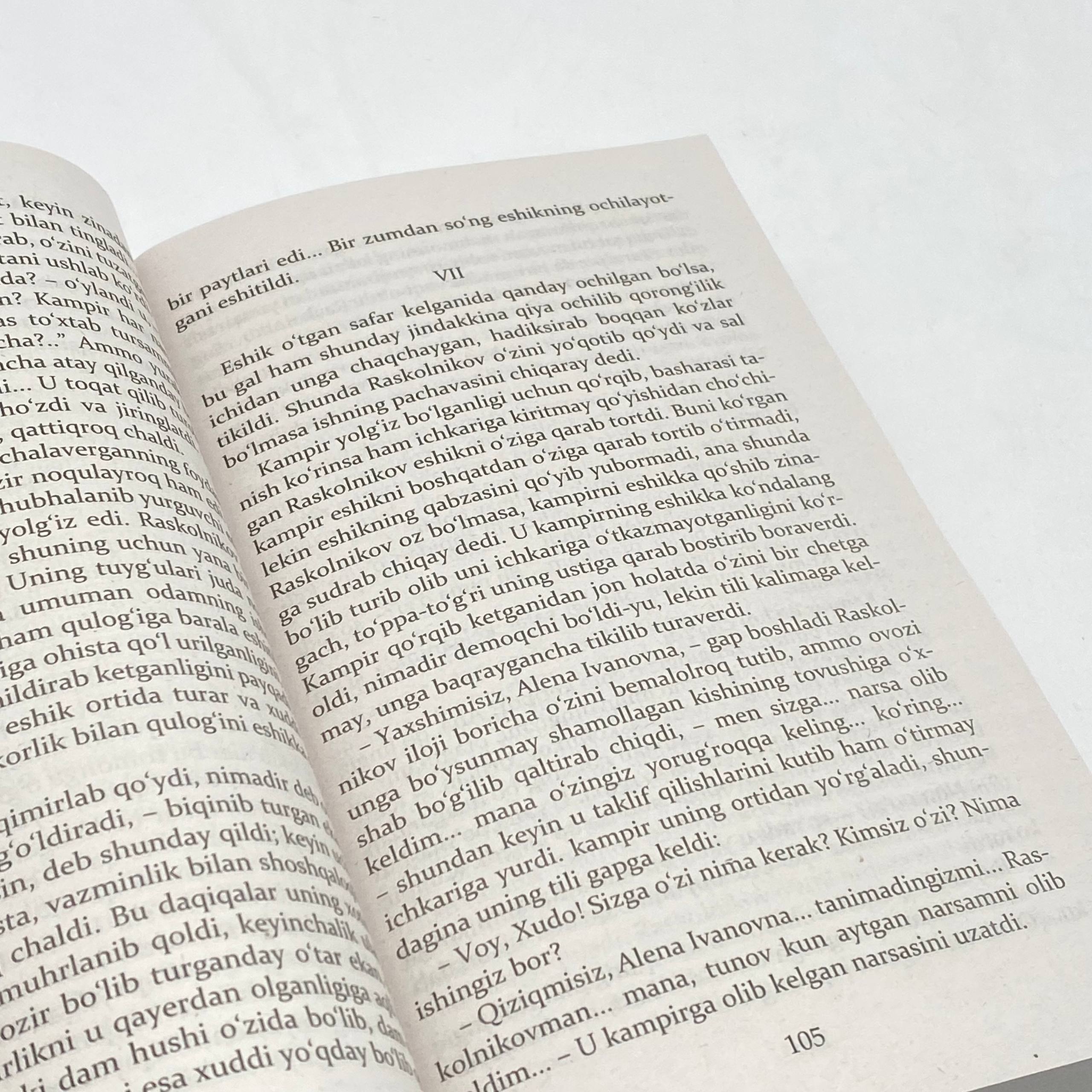 Asar 1866 yilda yozilgan. Ammo inson kechinmalarining eski va yangisi bo‘lmaganidek, roman qadri ham eskirmagan. Kitob o‘zbek tilida bundan avval 1977 yilda chop etilgan. Qariyb 40 yildan keyin asarni qayta nashr etishdan maqsadimiz, bugungi kitobxonlarimizni o‘z davrida shuhrat qozongan asar – talaba hayotidan ayanchli drama bilan tanishtirish. «Kambag‘allik ayb emas, biroq yo‘chilik – illat. Birinchisida inson tug‘ma olijanob fazilatlarni saqlab qola oladi, ammo yo‘qchilikda ularni hech qachon va hech kim saqlab qola olmaydi», asardagi personajlaridan biri bosh qahramonga bu gapni hayotiy misollar asosida izohlab beradi. Universitetning sobiq talabasi bo‘lgan Raskolnikov esa bu gapdan tegishli xulosa chiqara olmaydi. Natijada, yo‘qchilikdan qutulish, tezda boyib ketish va yuqori mavqeiga ega bo‘lish maqsadida aql bovar qilmaydigan jinoyat sodir qiladi. Fojiali jihati – qahramon o‘z jinoyatini oqlaydi. Ammo hayot qonunlari adolatli – jinoyatni jazosiz qolishiga imkon bermaydi. Ruhiy jazo jinoyatchini o‘z aybiga iqror bo‘lishga majbur etadi. Romanda shu mudhish qotillikning uzluksiz uqubatlari bilan birga go‘zal muhabbat tasviri ham borki, u kitobxon qalbini beixtiyor junbishga keltiradi.