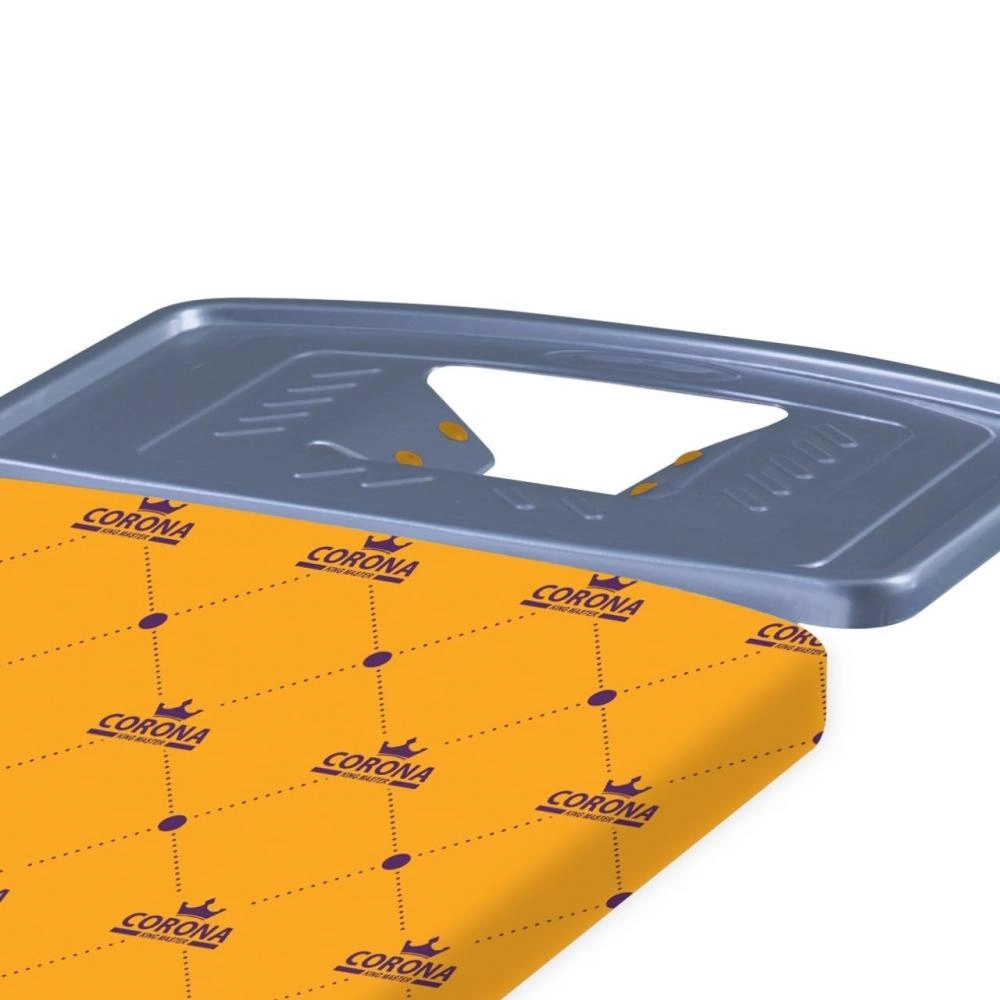 Corona Gloria производится из высокопрочных материалов, например, из ДСП, которое послужило материалом для основы. Металлические ножки обеспечат устойчивость. В конструкции гладильной доски присутствует компактный подутюжник, а также удобный удлинитель для утюга.