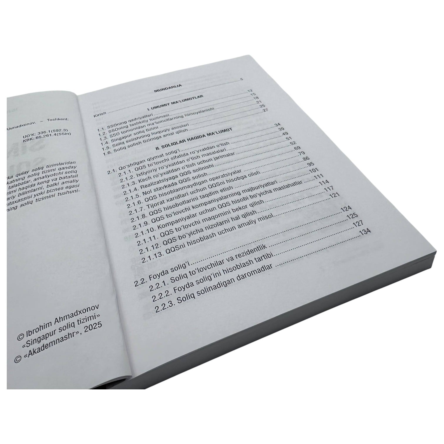 Singapur dunyodagi eng samarali va tadbirkorlikka qulay soliq tizimlaridan biriga ega davlat sifatida tan olingan. Kitobda mamlakatning soliq tizimi qanday tashkil etilgani, uning asosiy turlari tahlil qilinadi. Kitob talabalar, amaliyotchi soliq maslahatchilari va tadbirkorlarda Singapurning soliq tizimi haqida keng va batafsil tasavvur hosil qilishga yordam beradi. U nafaqat nazariy bilimlarni, balki amaliy tushunchalarni ham berishni ko'zlaydi. Talaba, soliq mutaxassisi yoki biznes egasi bo'lasizmi, bugungi o'zaro bog'liq dunyoda Singapurning soliq tizimini tushuni- shingiz muhim ahamiyat kasb etadi.