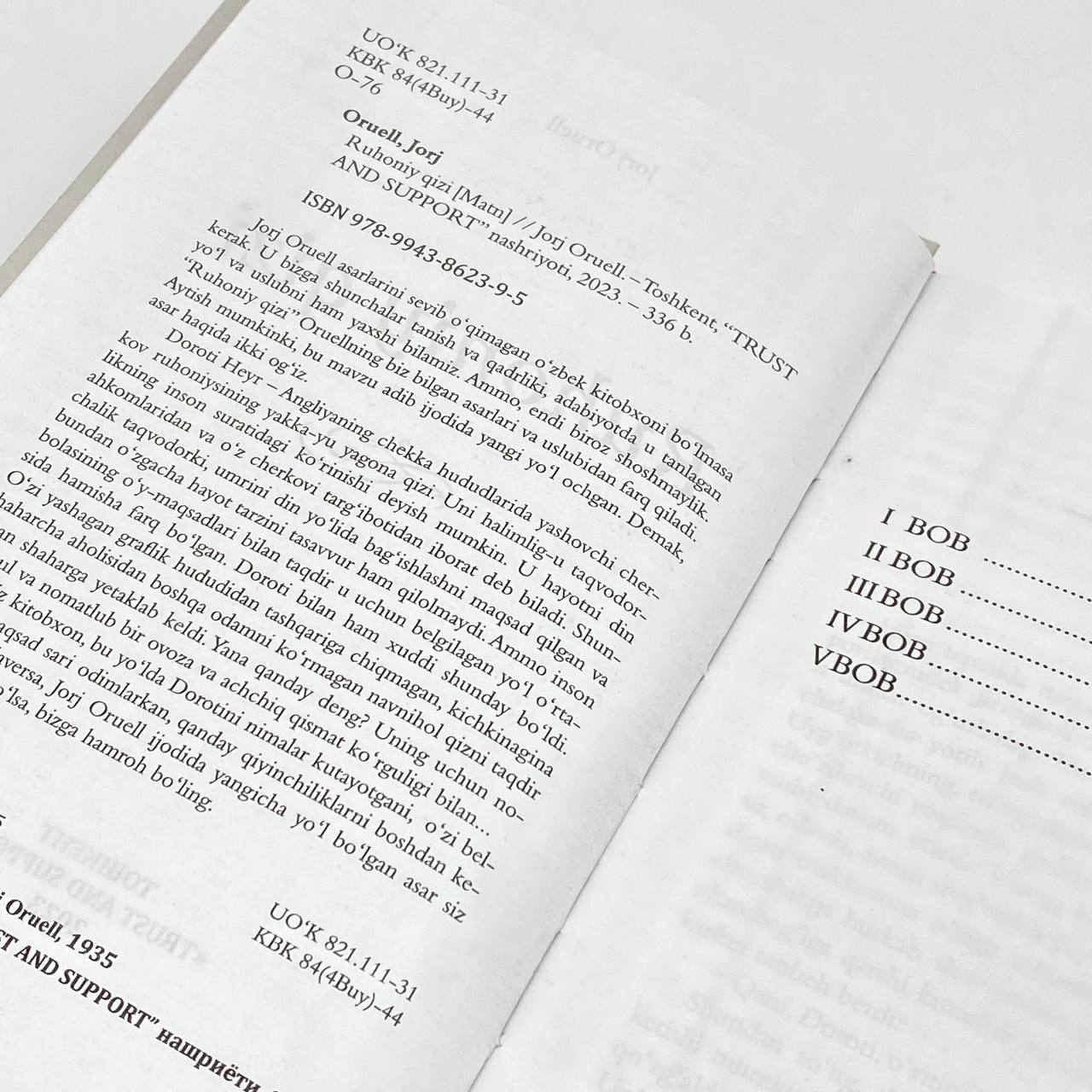 Ishlab chiqaruvchidan 1 yil kafolat. Mahsulotni 10 kun ichida qabul qilamiz va darhol pulni qaytaramiz.Ruhoniy qizi — Jorj Oruell tomonidan yozilib, ilk bor 1935-yilda nashr etilgan roman. Asar ruhoniy qizi Doroti Xarening xotirasini yoʻqotgani va oʻzligini qaytadan yaratgani haqida hikoya qiladi. Oruell Dorotining bu kabi hayotiy sarguzashtlari orqali ijtimoiy sinf, axloq hamda shaxsning oʻzgarishi haqida soʻz yuritgan.