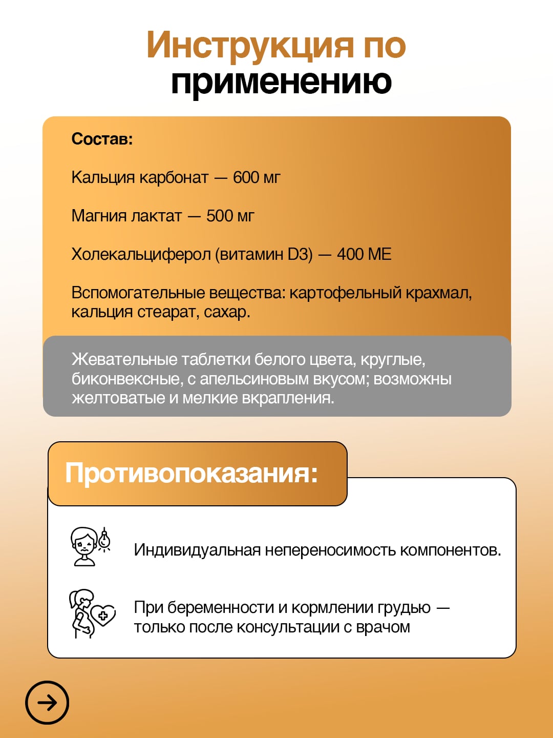 Apelsin ta’mli chaynalmali tabletkalar suv bilan ichishni talab qilmaydi va kundalik foydalanish uchun qulay.