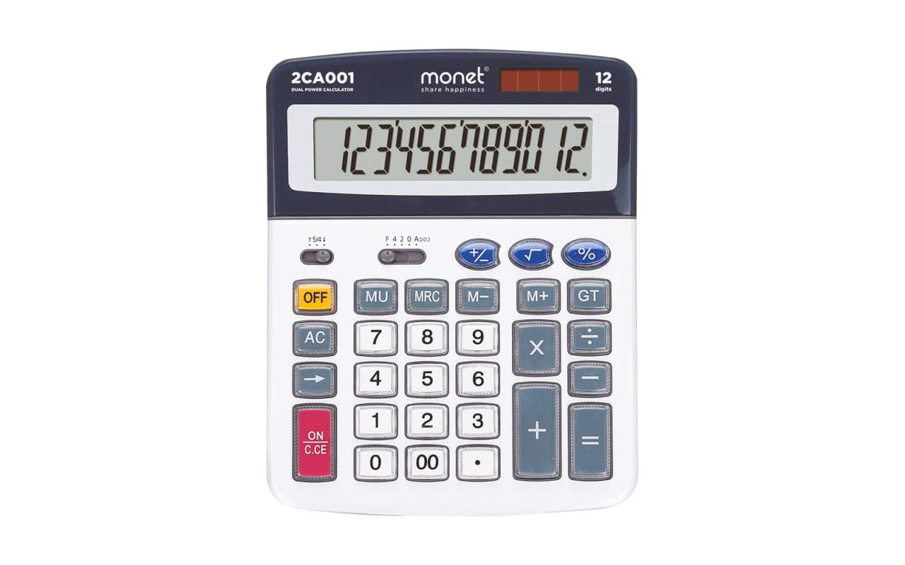 Monet 2CA001 ish stoli kalkulyatori buxgalter, maktab o'quvchisi, talaba, sotuvchi va xodim uchun ofisda, ishda, maktabda, do'konda yoki universitetda ishlashda ajralmas yordamchidir. Kalkulyator barcha asosiy arifmetik amallarni bajaradi. Soliqlar va savdo marjalarini hisoblash uchun "00" va MU ikki tomonlama xotira kalitlari mavjudligi sababli buxgalterlar uchun ajralmas hisoblanadi. O'nli kasrni yaxlitlash va joylashtirish tugmasi sizga kerakli sozlamalarni amalga oshirishga imkon beradi. Katta o'n ikki bitli displey katta qiymatlarni yuqori yaxlitlash aniqligi bilan namoyish etadi. Ikki tomonlama quvvat kalkulyatorning uzoq vaqt ishlashiga imkon beradi va o'chirish tugmasi va avtomatik o'chirish funktsiyasi (8-10 daqiqalik harakatsizlikdan keyin) batareyani almashtirmasdan uning ishlash muddatini maksimal darajada oshirishga imkon beradi. O'lchami 200x156 mm. aaa batareyasi (kichik barmoq) kiritilmagan.
