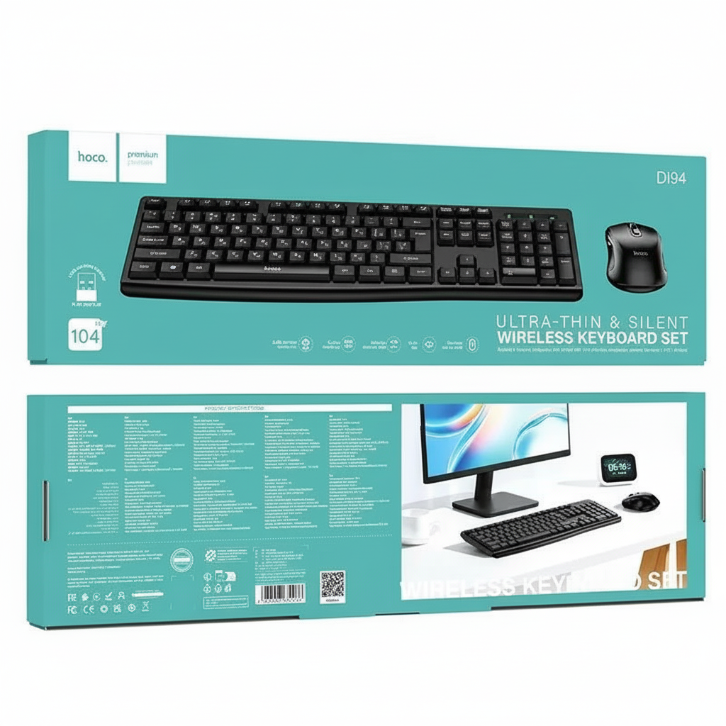 Hooco DI94 — bu uslub, ishonchlilik va funksionallikning mukammal uyg‘unligi. 104 ta tugmali klaviatura uzoq vaqt ishlash uchun juda mos: yumshoq, jimgina va qo‘lga juda qulay. Sichqoncha esa o‘ng qo‘l uchun mo‘ljallangan klassik ergonomik dizaynga ega bo‘lib, aniq va qulay boshqaruv beradi. 2.4 GHz radioulanish bir necha metrga qadar ishonchli aloqa ta’minlaydi, USB qabul qilgichi esa ish joyingizni tartibli qiladi. Bu to‘plam ofis, uy, o‘qish, matn terish, onlayn ish va kundalik vazifalar uchun juda mos.