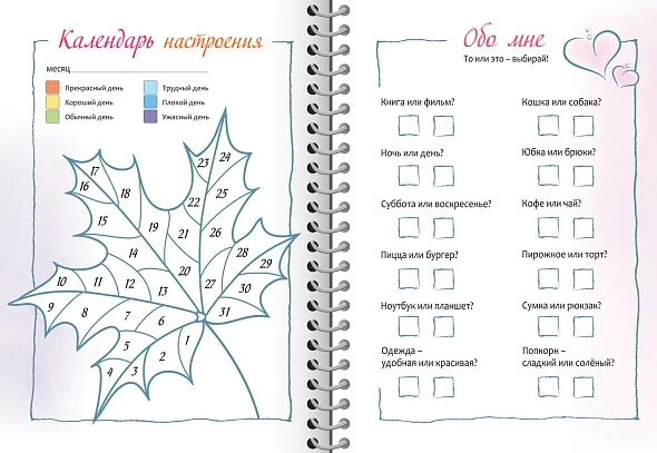 Bloknot ichida qiziqarli savollar, kichik testlar va kayfiyat kalendarlari ham mavjud bo‘lib, foydalanishni yanada zavqli va foydali qiladi.
