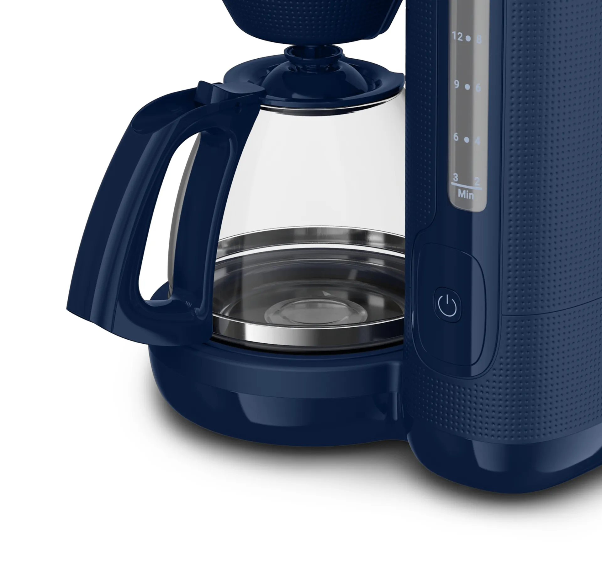 Zamonaviy va amaliy tomchi usulidagi kofe tayyorlagich ko‘k rangdagi nafis korpusda — yangi maydalangan kofe hidi va qulaylikni qadrlovchilar uchun mukammal tanlov.