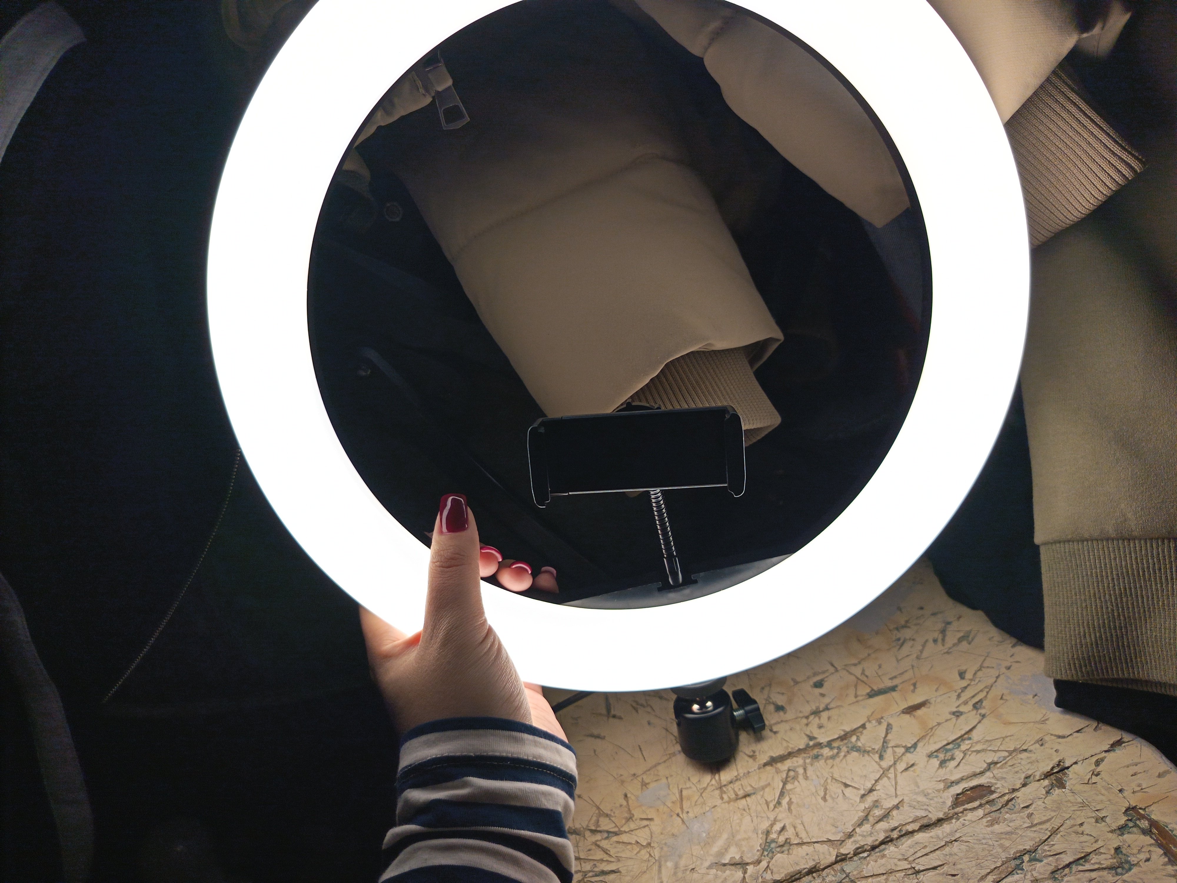 Halqali chiroq kamera yoki smartfon uchun xavfsiz ushlagich bilan jihozlangan. U kenglikda sozlanishi, moslashuvchan oyoq ushlagichining moyilligi va aylanishini o'zgartirishi mumkin.