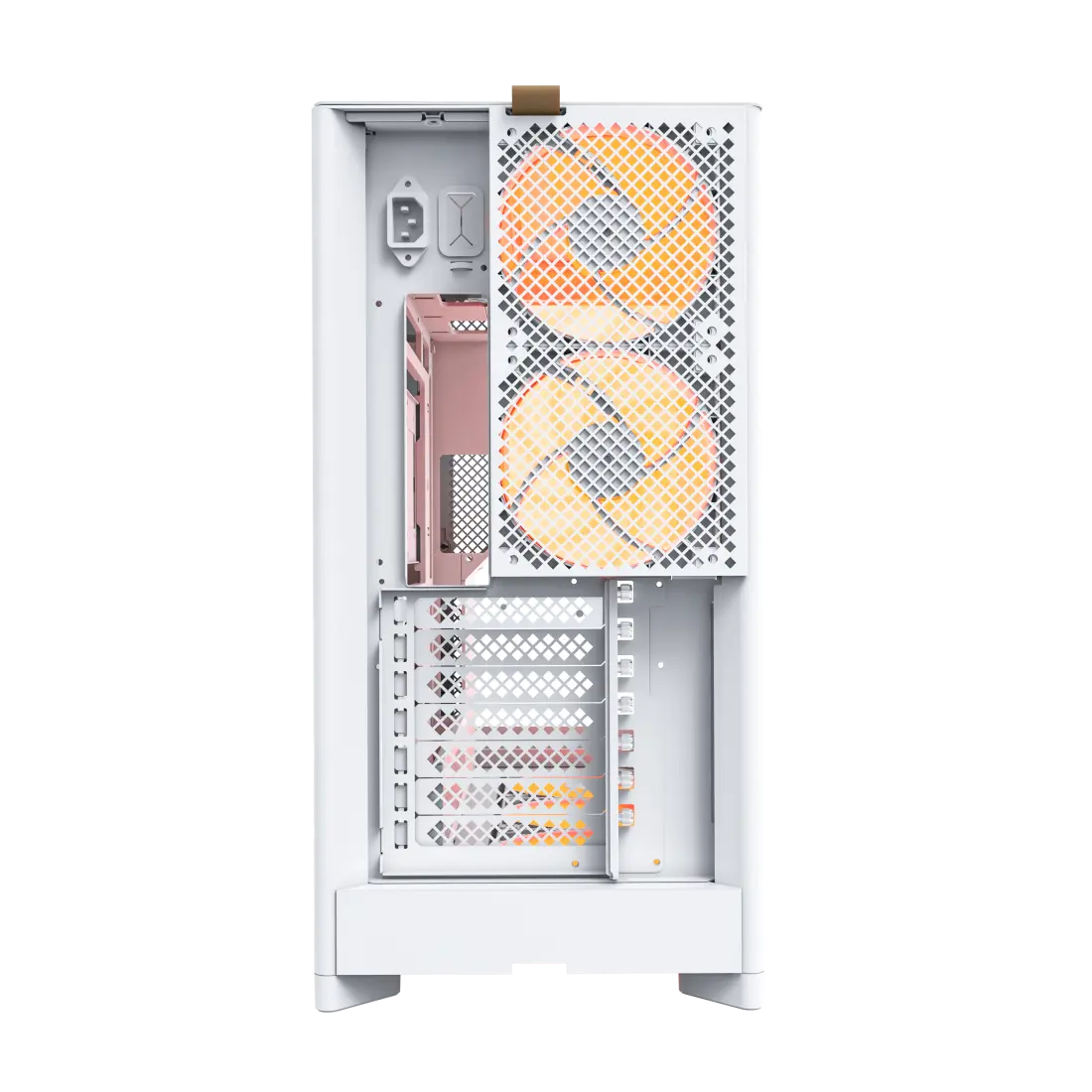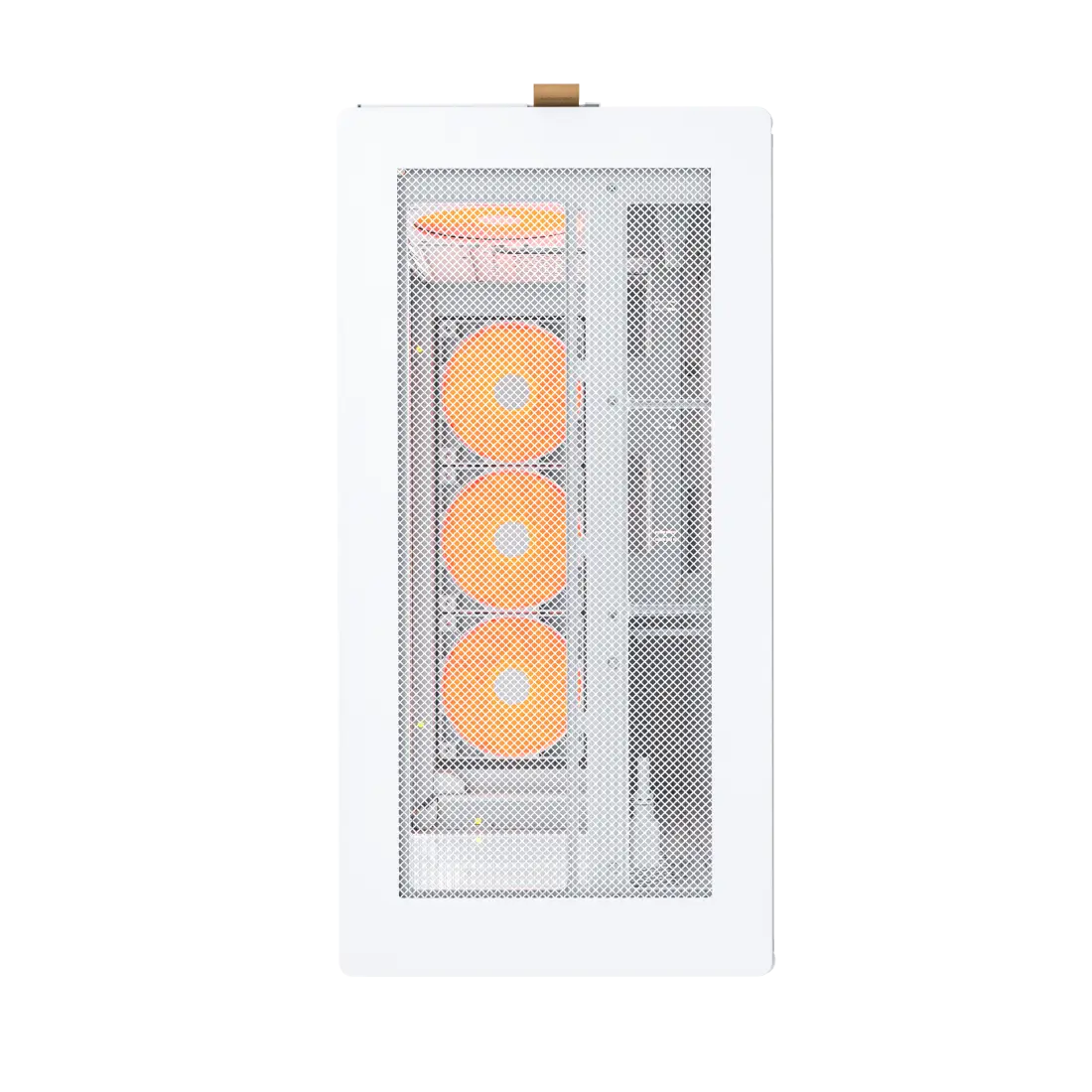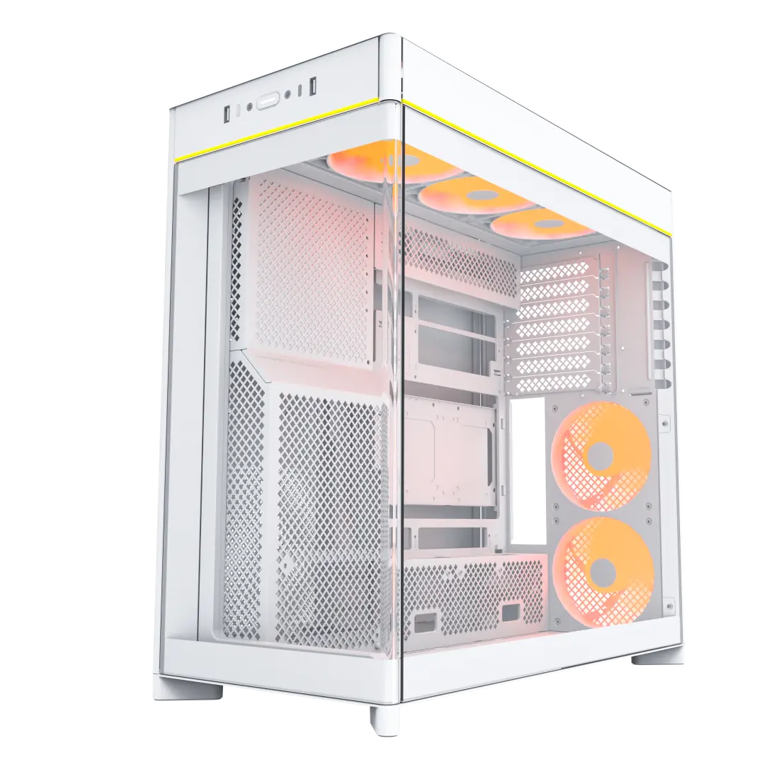 Korpus 5 ta ARGB ventilyator bilan jihozlangan — 3 tasi pastda, 2 tasi orqa qismda joylashgan. Bu nafaqat kuchli sovutish, balki yorqin dizayn effektini ham ta’minlaydi.