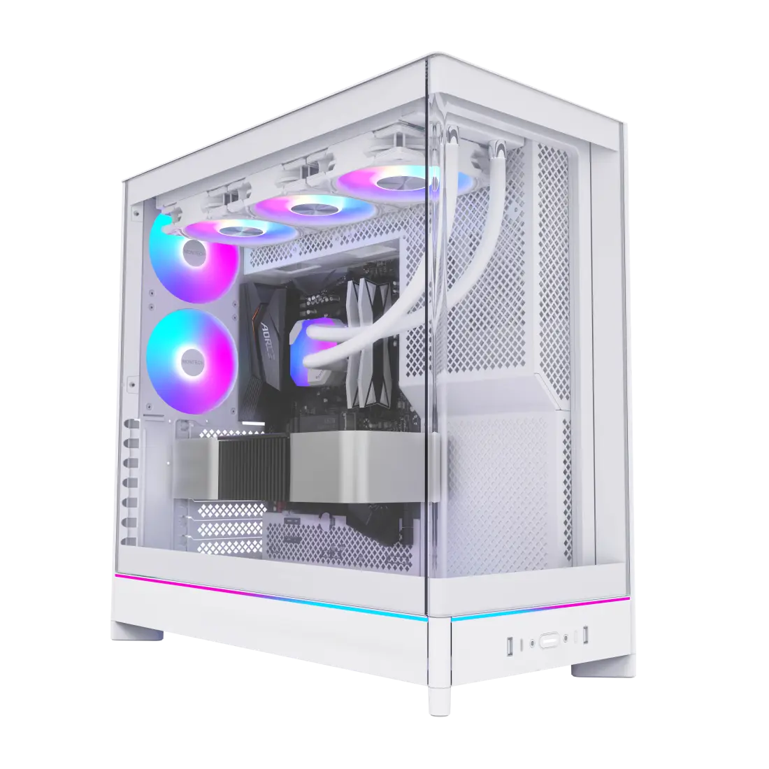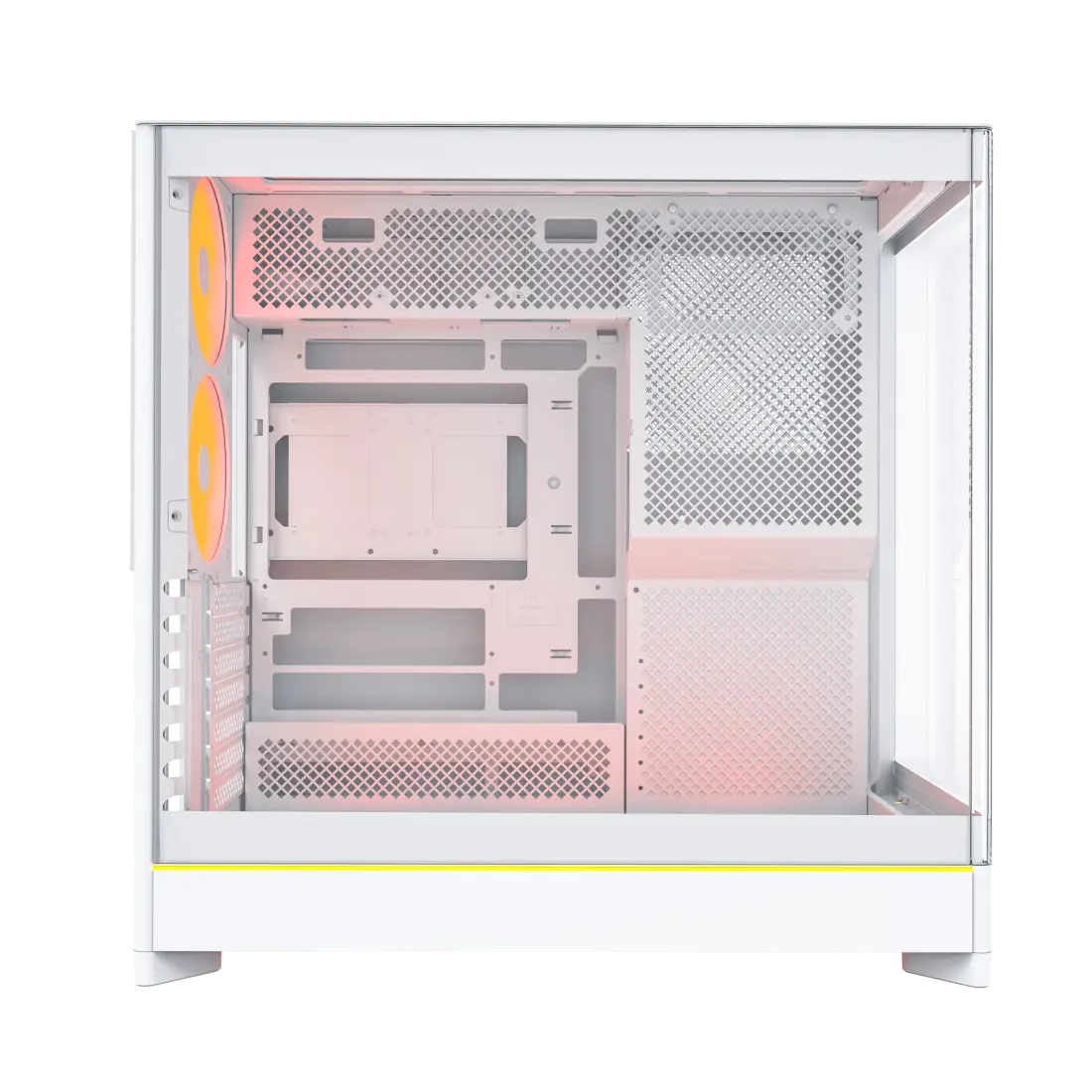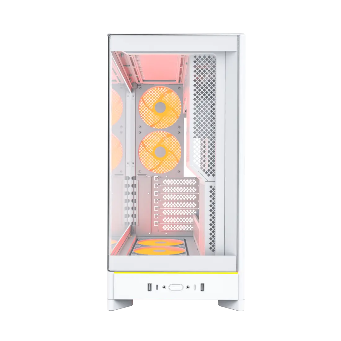 Korpus 5 ta ARGB ventilyator bilan jihozlangan — 3 tasi pastda, 2 tasi orqa qismda joylashgan. Bu nafaqat kuchli sovutish, balki yorqin dizayn effektini ham ta’minlaydi.