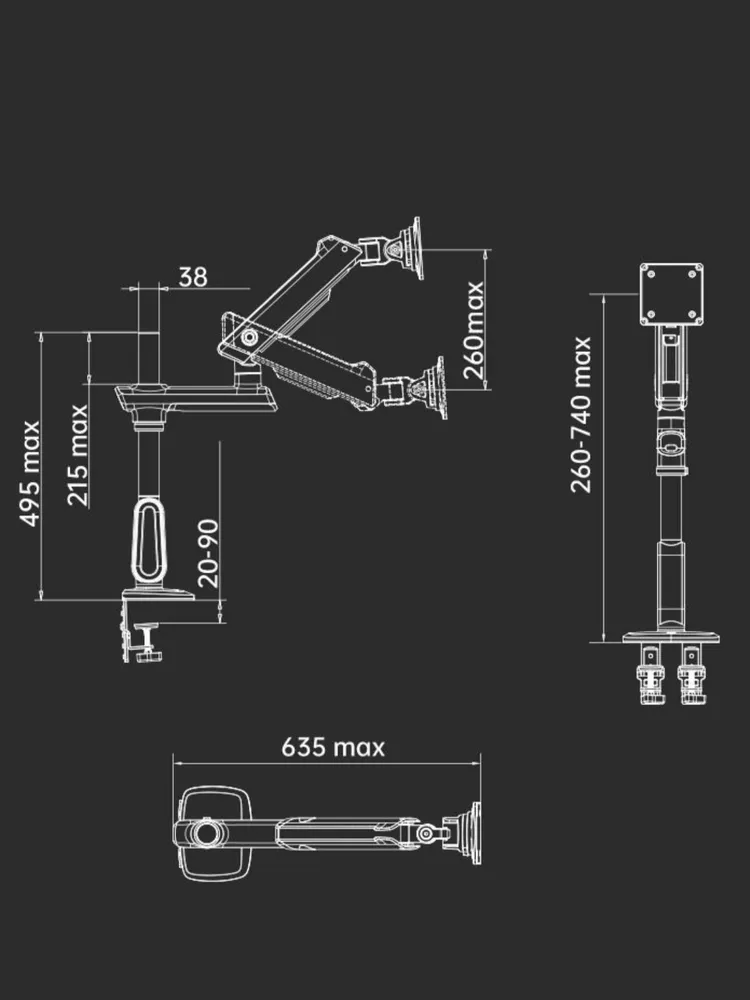 32" dan 60" dyuymgacha bo‘lgan, 20 kg gacha bo‘lgan monitorlarni qo‘llab-quvvatlaydi