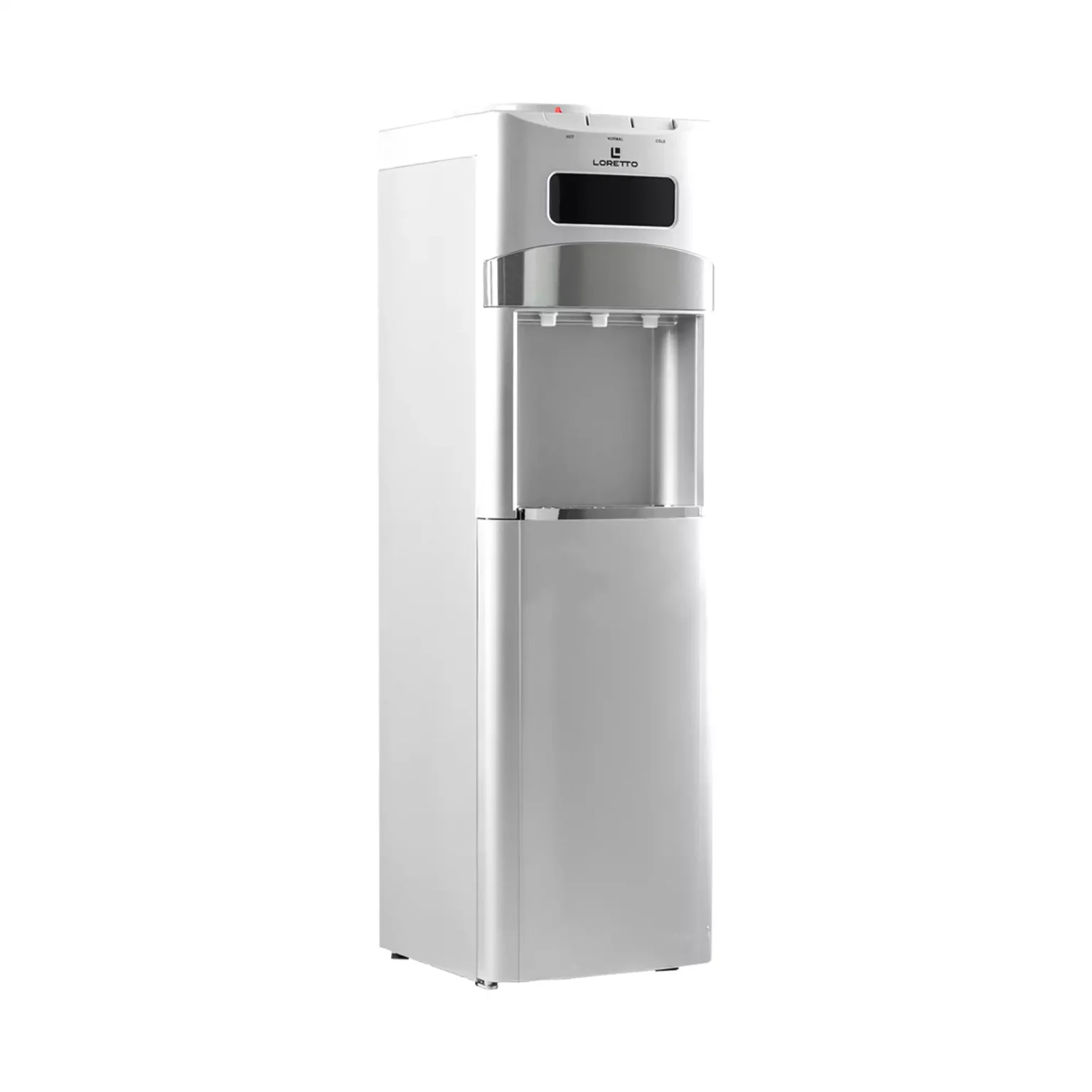 Loretto LD-101RS suv sovutgichi nafis kumush rangga ega bo‘lib, funksionallik va qulaylikni birlashtiradi. U yuqoridan butilka o‘rnatish tizimi bilan jihozlangan bo‘lib, suv darajasini nazorat qilish va idishni tez almashtirish imkonini beradi, shuningdek, tugmachali boshqaruv orqali suvni qulay va oson olish mumkin. Model suvni isitish va sovutish imkoniyatiga ega, va issiq suv kranida bolalar uchun himoya mavjudligi uni oilaviy foydalanish uchun xavfsiz qiladi. Qo‘shimcha sifatida, kuler sovutish kamerasiga ega bo‘lib, ichimliklar va oziq-ovqat mahsulotlarini yangi holatda saqlash imkonini beradi, bu esa qurilmaning funksionalligini kengaytiradi. Loretto LD-101RS uy, ofis yoki har qanday jamoat joyi uchun ideal bo‘lib, nafis dizayn, qulaylik va amaliylikni birlashtiradi.