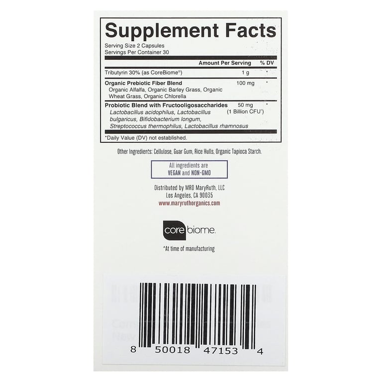 Postbiotic CoreBiome® (Tributyrin 30%) — 1 g porsiyada: ichak shilliq qavatining yaxlitligini saqlash uchun qisqa zanjirli yog‘ kislotalari;