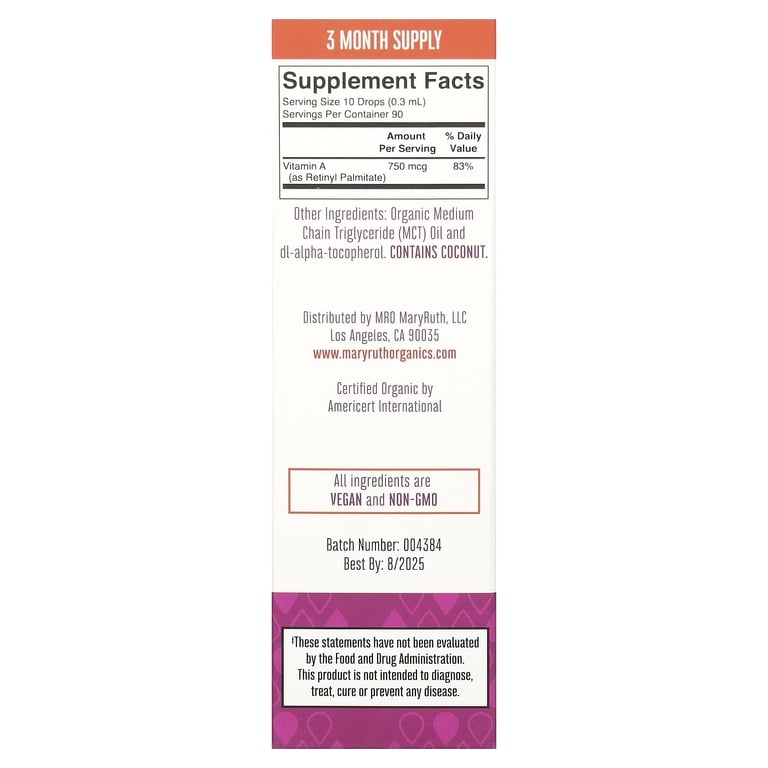 Retinilpalmitat normal ko‘rish uchun muhim komponent hisoblanadi. Doimiy qabul qilish ko‘zlarning yorug‘likka moslashuvini yaxshilaydi va retinaning sog‘lomligini qo‘llab-quvvatlaydi. MaryRuth’s A vitaminini tabiiy va xavfsiz shaklda taqdim etadi, GMO, konservantlar va sun’iy qo‘shimchalarsiz.