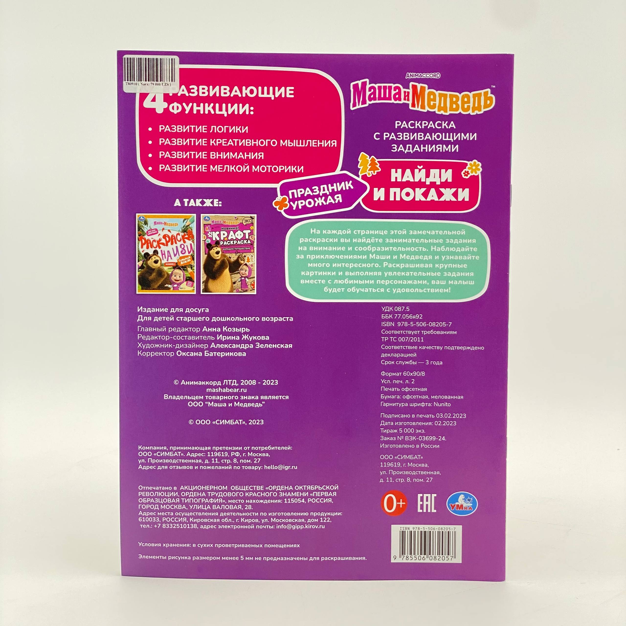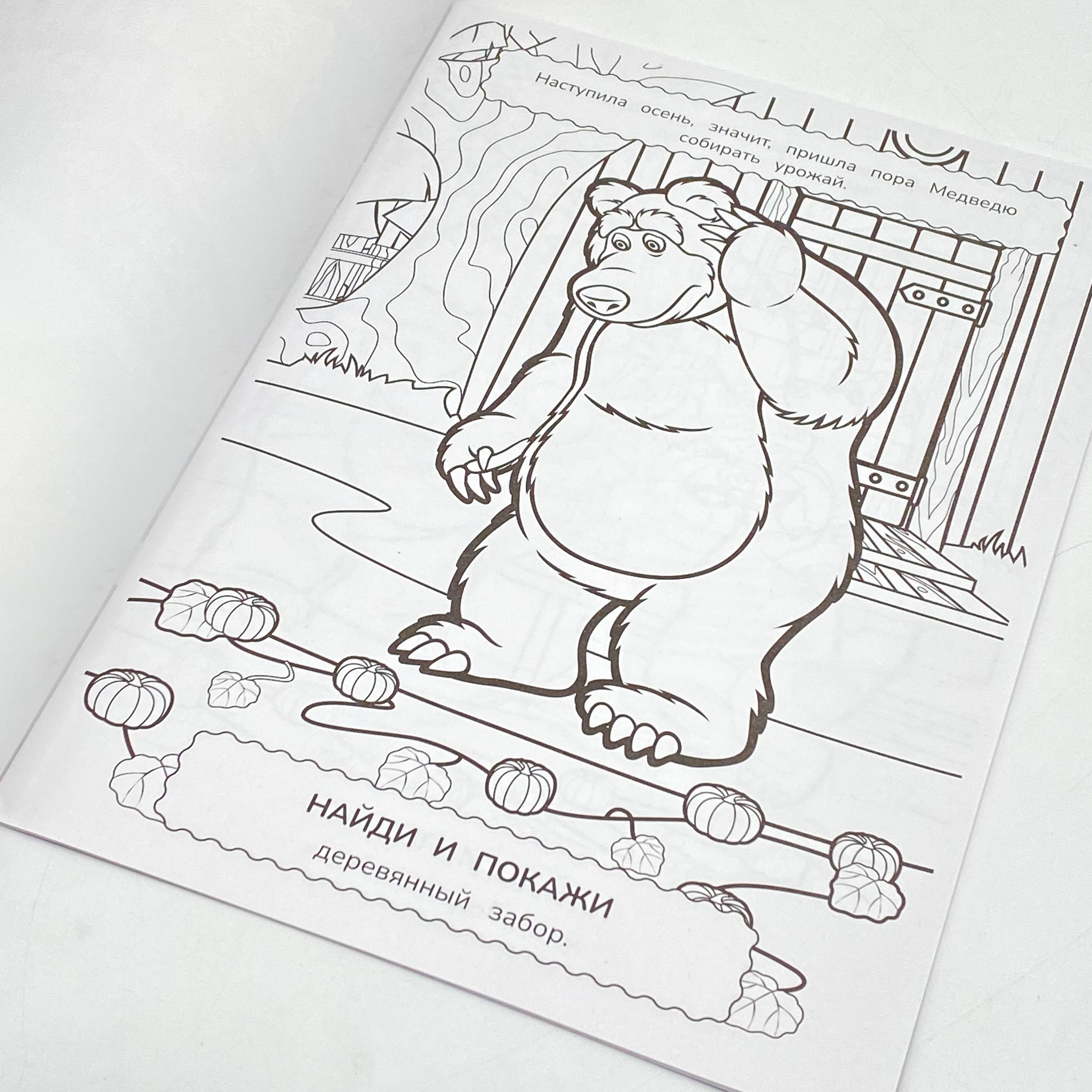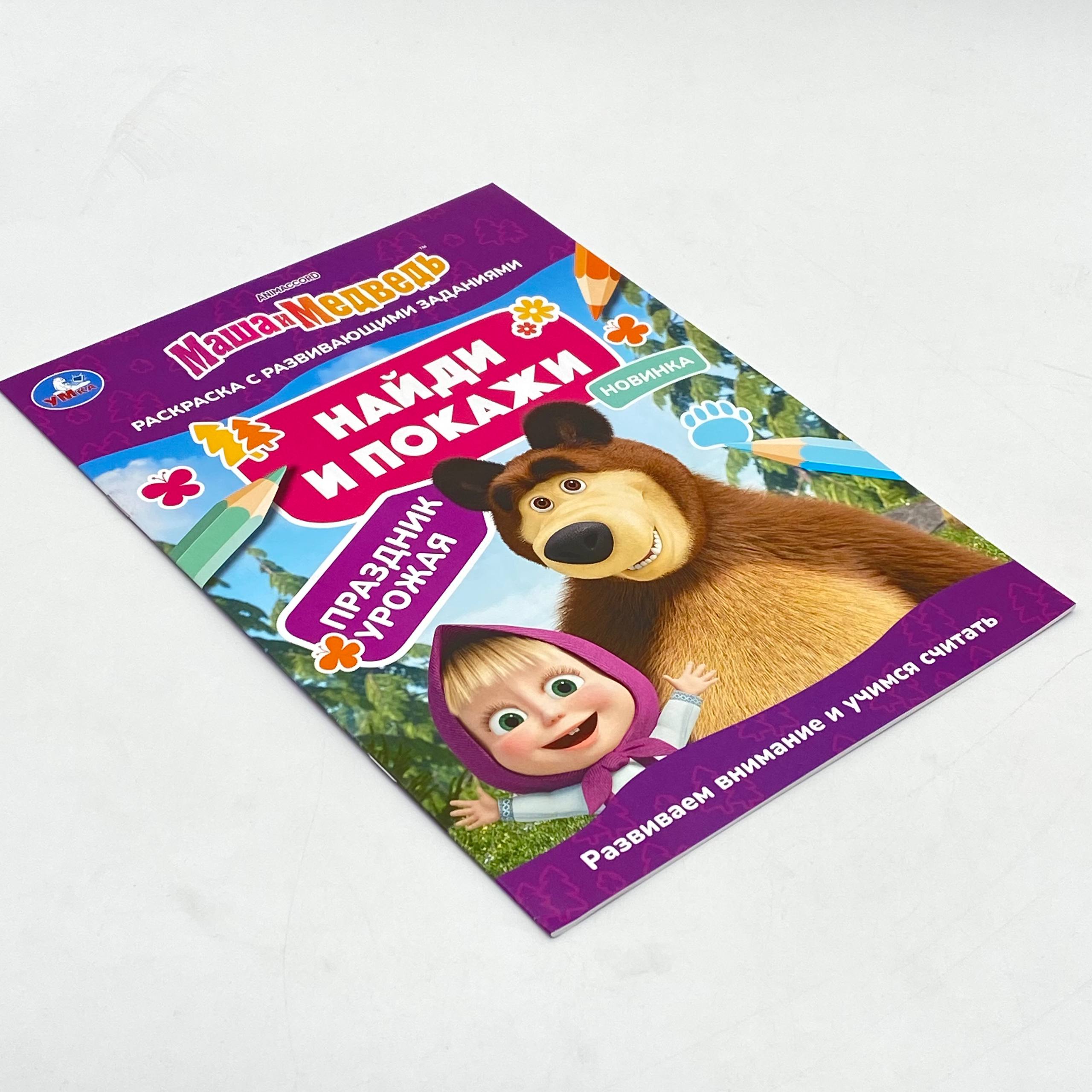 Раскраска с развивающими заданиями "Маша и Медведь. Праздник урожая" из серии "Найди и покажи" станет отличным подарком для маленьких поклонников мультсериала про озорную девочку Машу: