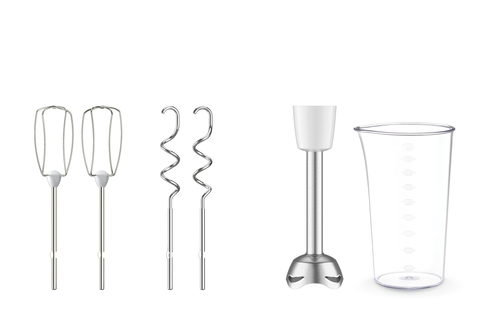 Qo‘shimchalar: 2 ko‘pirtirgich, 2 xamir ganchalari, qo‘l blenderi, o‘lchash stakani