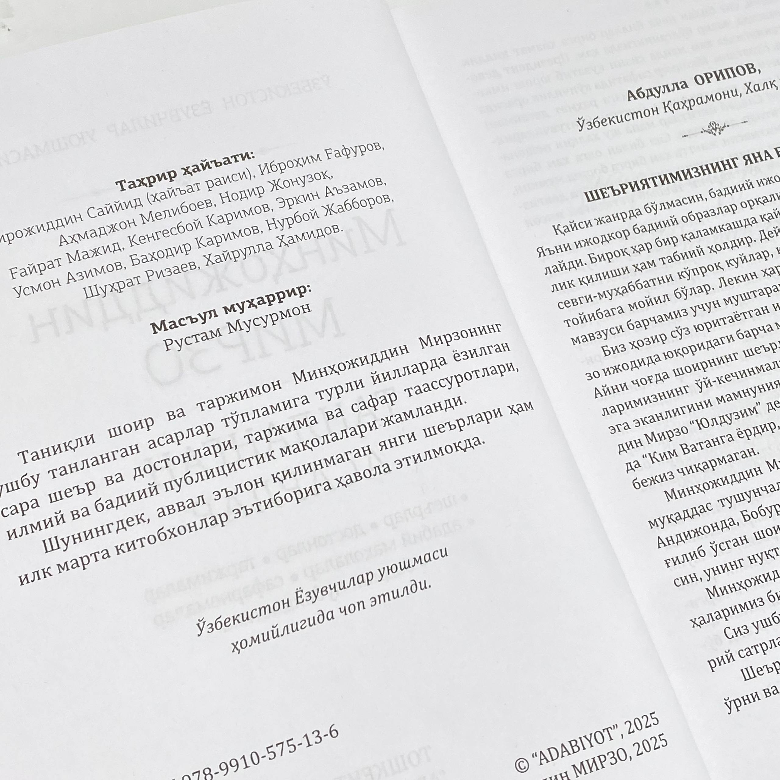 Taniqli shoir va tarjimon Minhojiddin Mirzoning ushbu tanlangan asarlar to‘plamiga turli yillarda yozilgan sara she’r va dostonlari, tarjima va safar taassurotlari, ilmiy va badiiy publitsistik maqolalari jamlandi.