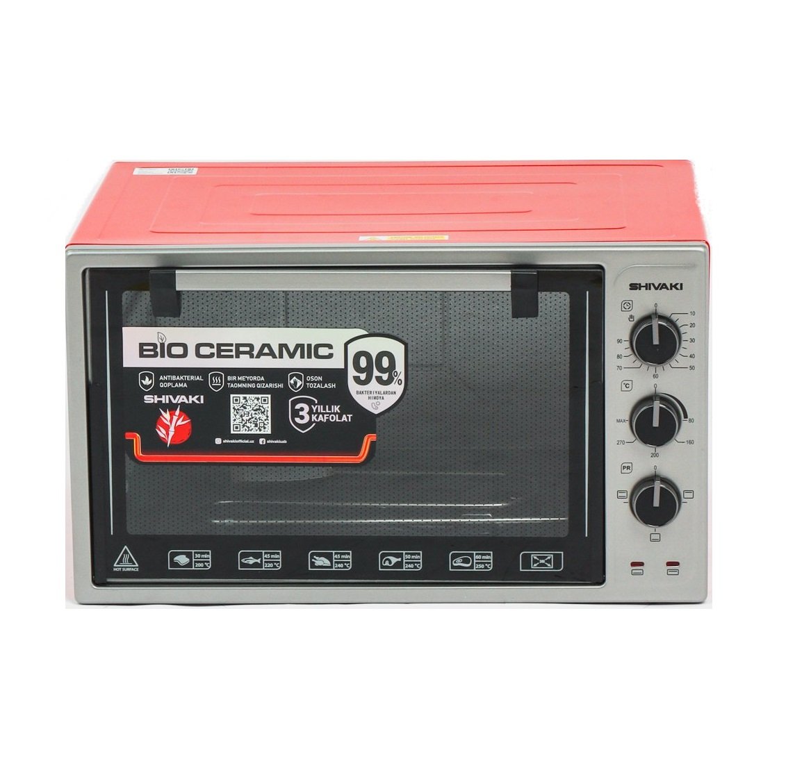 Ushbu model zamonaviy kulrang-qizil rang dizayni bilan ajralib turadi va har qanday oshxonaga mos keladi. Shivaki 3618 E (S lampochkali) mini-pechi sizning uy oshxonangizda ishonchli yordamchi bo‘lib, qulaylik, yuqori samaradorlik va xavfsizlikni birlashtiradi.