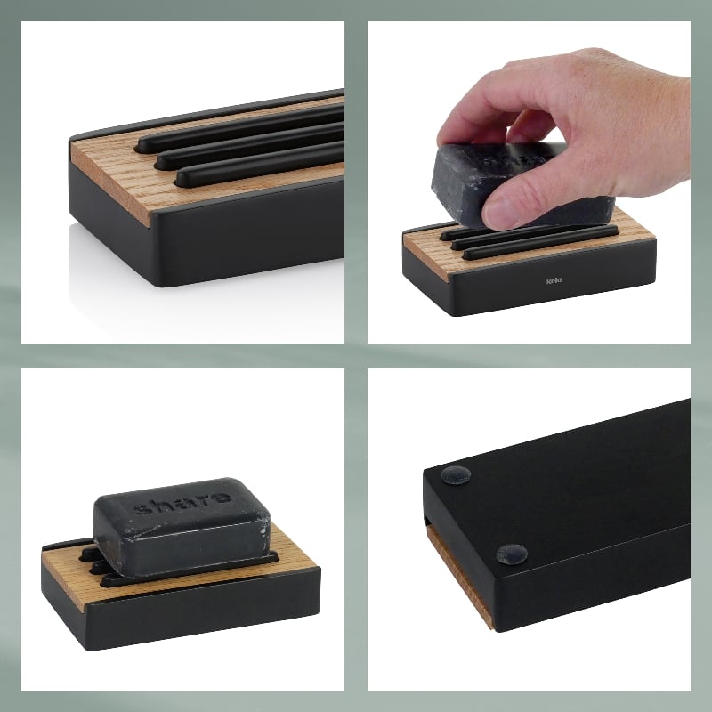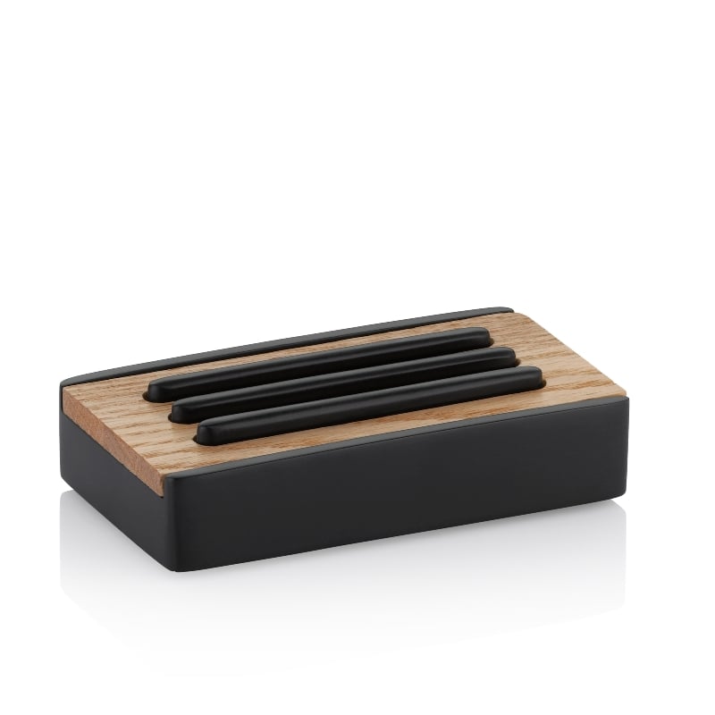 Bu tik turuvchi sovun idishi — mat qora plastmassa va tabiiy eman yog‘ochining mukammal uyg‘unligi bo‘lib, hammomingizga nafis aksent qo‘shadi. U zamonaviy minimalizm yoki skandinav uslubdagi har qanday interyerdagi mos keladi.
