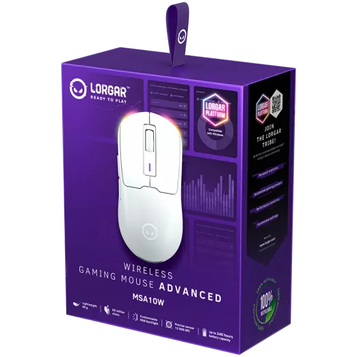 Lorgar MSA10W Wireless Gaming White sichqoni — bu yuqori aniqlikdagi o‘yin qurilmasi bo‘lib, 12 000 DPI ruxsatga ega, aniqlikni oshiradi va o‘yin salohiyatini to‘liq ochib beradi; asosiy tugmalar 50 million bosishga mo‘ljallangan, 6 ta dasturlanishi mumkin bo‘lgan tugma esa g‘alabali o‘yin uchun o‘z kombinatsiyalaringizni yaratishga imkon beradi. Ulanishning uch rejimi mavjud — tezkor simsiz 2,4 GHz, so‘rov chastotasi 1000 Hz, Bluetooth 5.3 va USB-C — har qanday sharoitda barqaror o‘yin imkonini beradi. Katta quvvatli batareya bilan RGB yoritilgan holatda 100 soat, yoritilmagan holatda esa 140 soat o‘yin, Bluetooth rejimida esa undan ham uzoq ishlash mumkin. Qurilma to‘liq LORGAR PLATFORM bilan mos keladi, sichqonni shaxsiy sozlash, RGB yoritishni boshqarish, boshqa LORGAR™ qurilmalari bilan sinxronlash, o‘yin metrikasini kuzatish va qo‘shimcha funksiyalardan foydalanish imkonini beradi. Aqlli energiya tejash tizimi sichqonni kutish rejimida 200 kungacha faol saqlaydi. MSA10W funksionallik va uslubni uyg‘unlashtiradi: model oq rangda taqdim etilgan, va yorqin RGB yoritish sizning o‘yin stantsiyangizga individual uslub qo‘shadi. Mustahkam USB kabeli (A/C) orqali sichqonni zaryadlash va o‘yin davom ettirish mumkin. Texnik xususiyatlari: LORGAR PLATFORM qo‘llab-quvvatlanadi, tugmalar resursi 50 mln bosish, individual RGB yoritish, sezgirlik 12 000 DPI, 6 ta dasturlanishi mumkin bo‘lgan tugma, batareya quvvati bilan ishlash vaqti — 240 soat, uch turdagi ulanish, tezlashish 35 g, mukammal sirpanish uchun Virgin PTFE oyoqlar, 100% teflon PTFE oyoqlar.