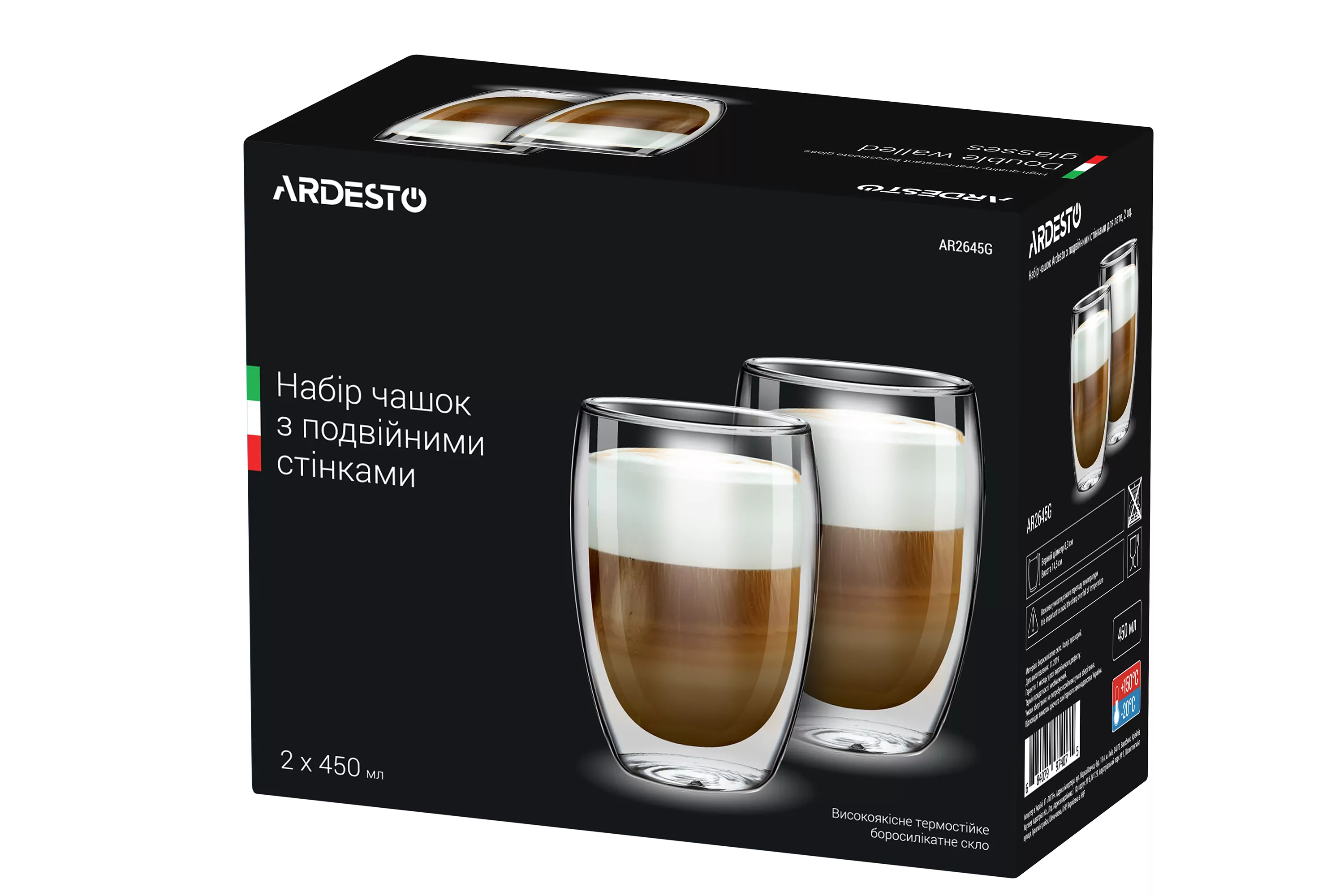 Latte uchun ikki qavatli ARDESTO stakanlar to‘plami, 450 ml, 2 dona — latte va boshqa issiq ichimliklarni sevuvchilar uchun ideal tanlov. To‘plamga har biri 450 ml hajmga ega bo‘lgan ikki stakan kiradi, ular sevimli ichimlikdan qulay zavq olish imkonini beradi.