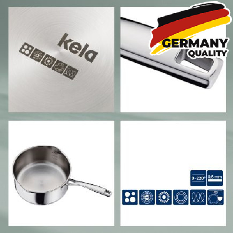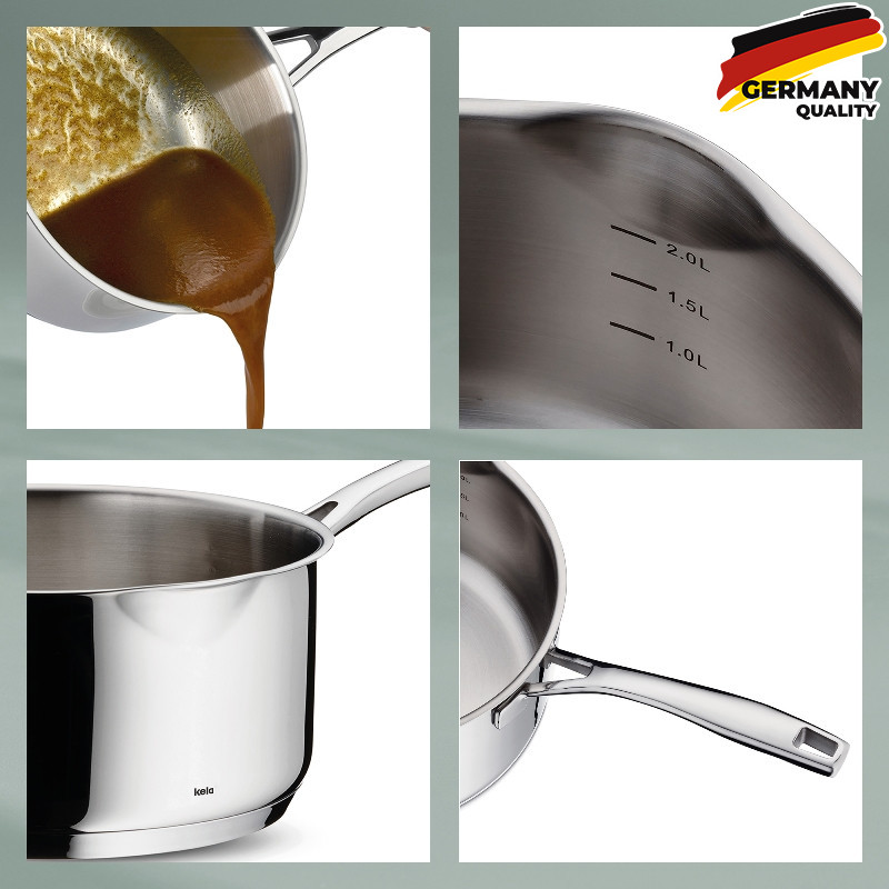 KELA Flavoria 10200 — bu turli hajmdagi uchta kovshdan iborat amaliy va uslubli oshxona to‘plami. Kovshlar yuqori sifatli 18/10 zanglamaydigan po‘latdan tayyorlangan bo‘lib, korroziyaga va yuqori haroratga chidamli. Ular sous tayyorlash, taomlarni isitish, suv qaynatish va boshqa pazandachilik vazifalari uchun juda mos keladi.