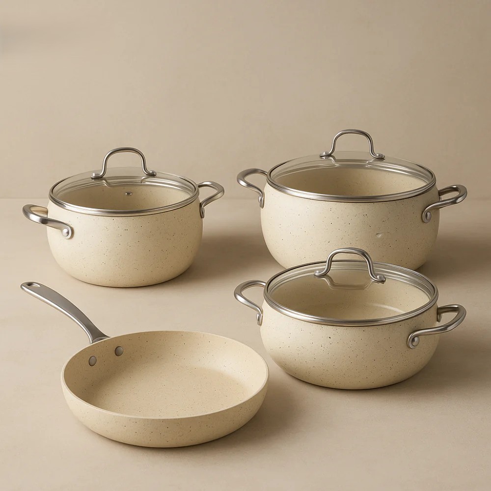 Ushbu to‘plam yordamida har qanday taomni qaynatish, dimlash, qovurish va isitish mumkin. Silliq yopishmaydigan qoplama kuyishni oldini oladi va minimal miqdordagi yog‘ bilan pishirish imkonini beradi, shu bilan birga mahsulotlarning ta’mi va foydasi saqlanadi. Idishlar tez va bir tekis qiziydi, ergonomik tutqichlar esa qulay foydalanishni ta’minlaydi.