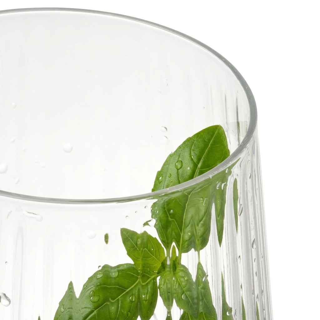 Optik Jilo: Yuzasidagi relyefli chiziqlar yorug'likni sindirib, ichimlikning jilosini jozibali ko'rsatadi. Bu dizayn stakanni qo'lda ushlashni ham osonlashtiradi.
