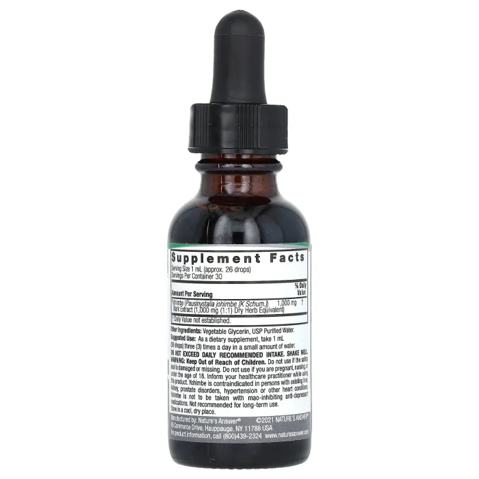 Nature's Answer brendi tomonidan ishlab chiqilgan yohimbe po‘stlog‘i ekstrakti — bu bardoshlilik, jismoniy tonus va umumiy hayotiy energiyani qo‘llab-quvvatlash uchun mo‘ljallangan kuchli o‘simlik qo‘shimchasidir. Yohimbe (Pausinystalia yohimbe) qadimdan tabiiy stimulyator sifatida tanilgan bo‘lib, u energiyani oshiradi, diqqatni jamlashni yaxshilaydi va jismoniy faollikni rag‘batlantiradi. Nature’s Answer formulasi spirt saqlamaydi va sovuq ekstraksiya texnologiyasi asosida ishlab chiqarilgan bo‘lib, o‘simlikdagi faol moddalar maksimal darajada saqlanib qoladi.
