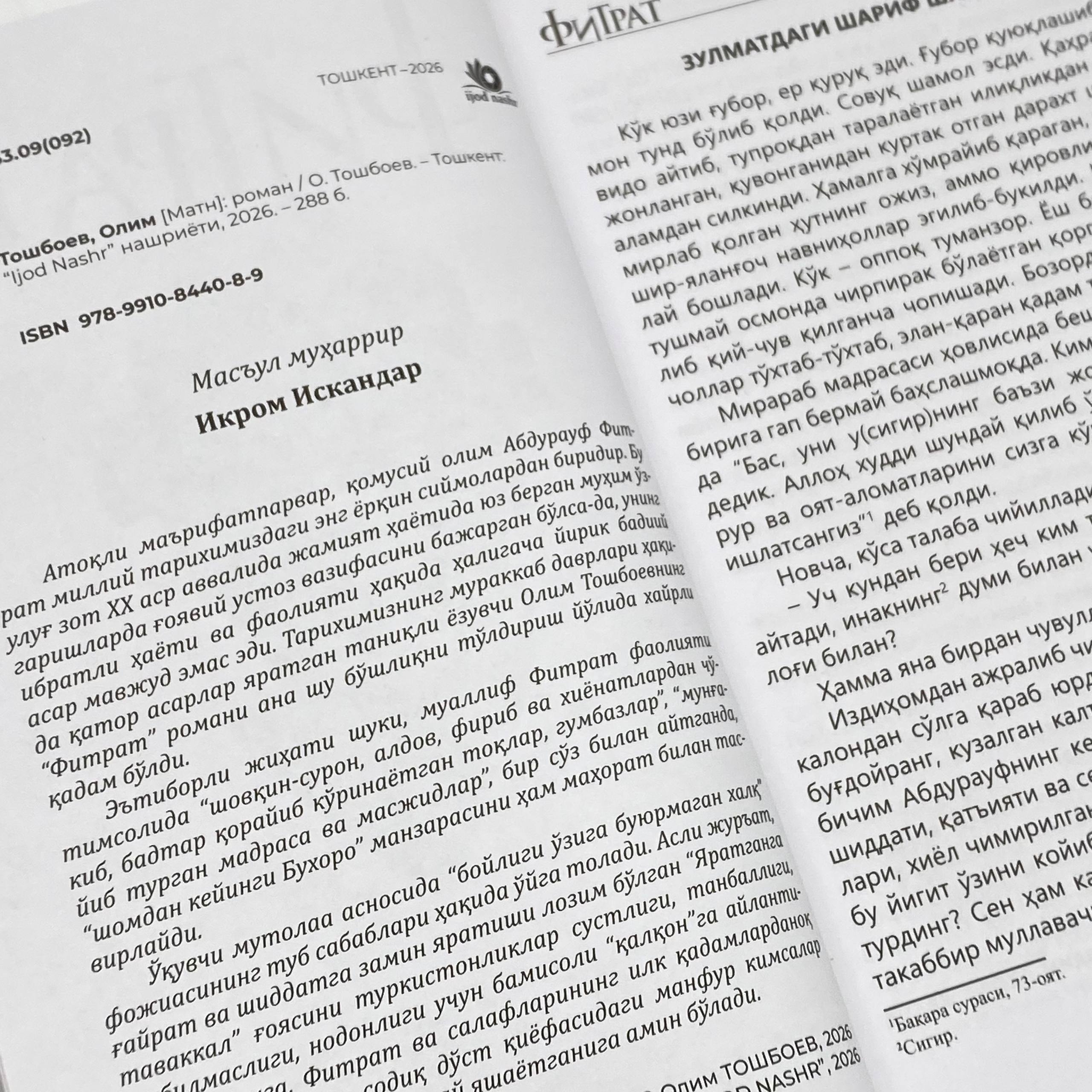 Atoqli ma’rifatparvar, qomusiy olim Abdurauf Fitrat milliy tariximizdagi eng yorqin siymolardan biridir. Bu ulug‘ zot XX asr avvalida jamiyat hayotida yuz bergan muhim o‘zgarishlarda g‘oyaviy ustoz vazifasini bajargan bo‘lsa-da, uning ibratli hayoti va faoliyati haqida haligacha yirik badiiy asar mavjud emas edi.