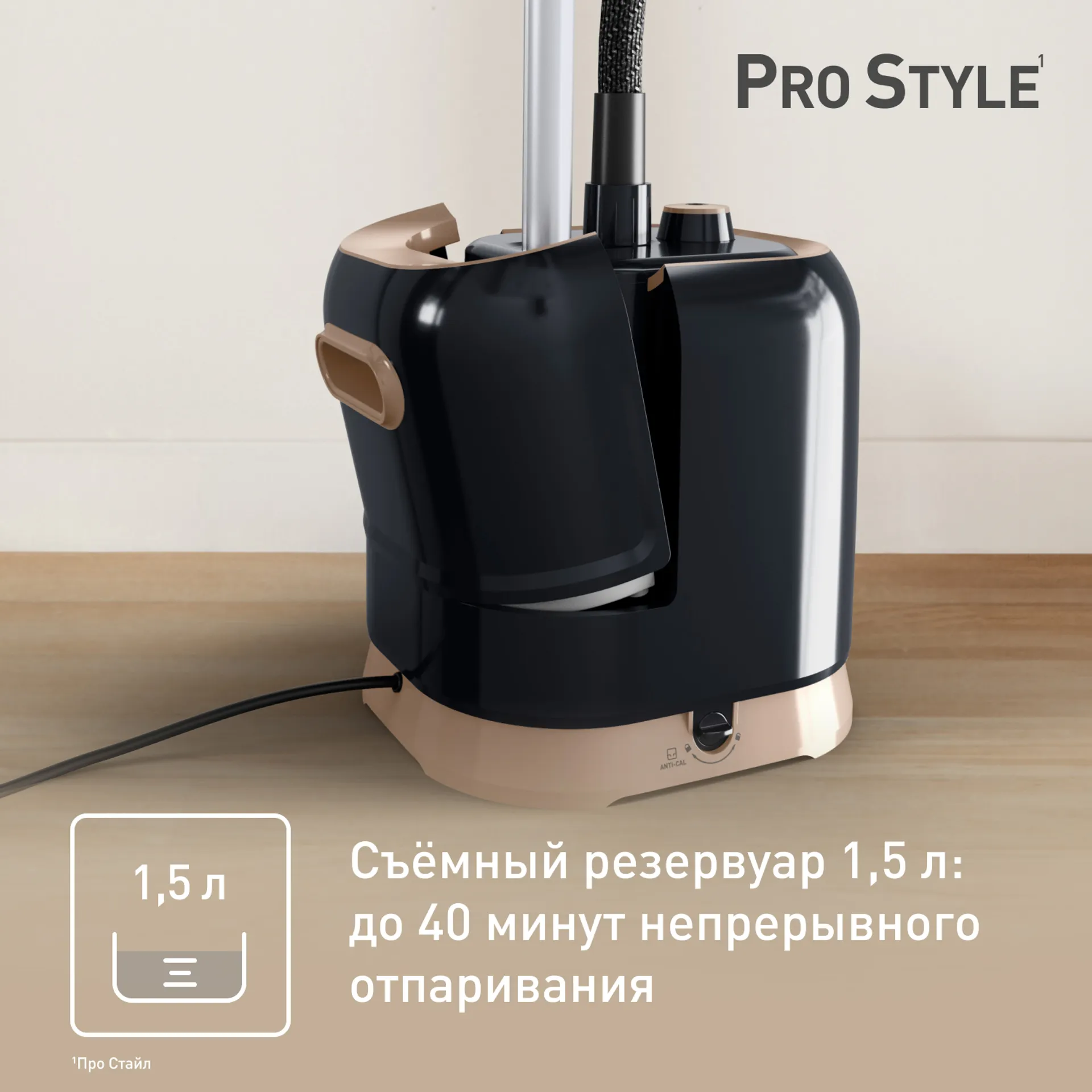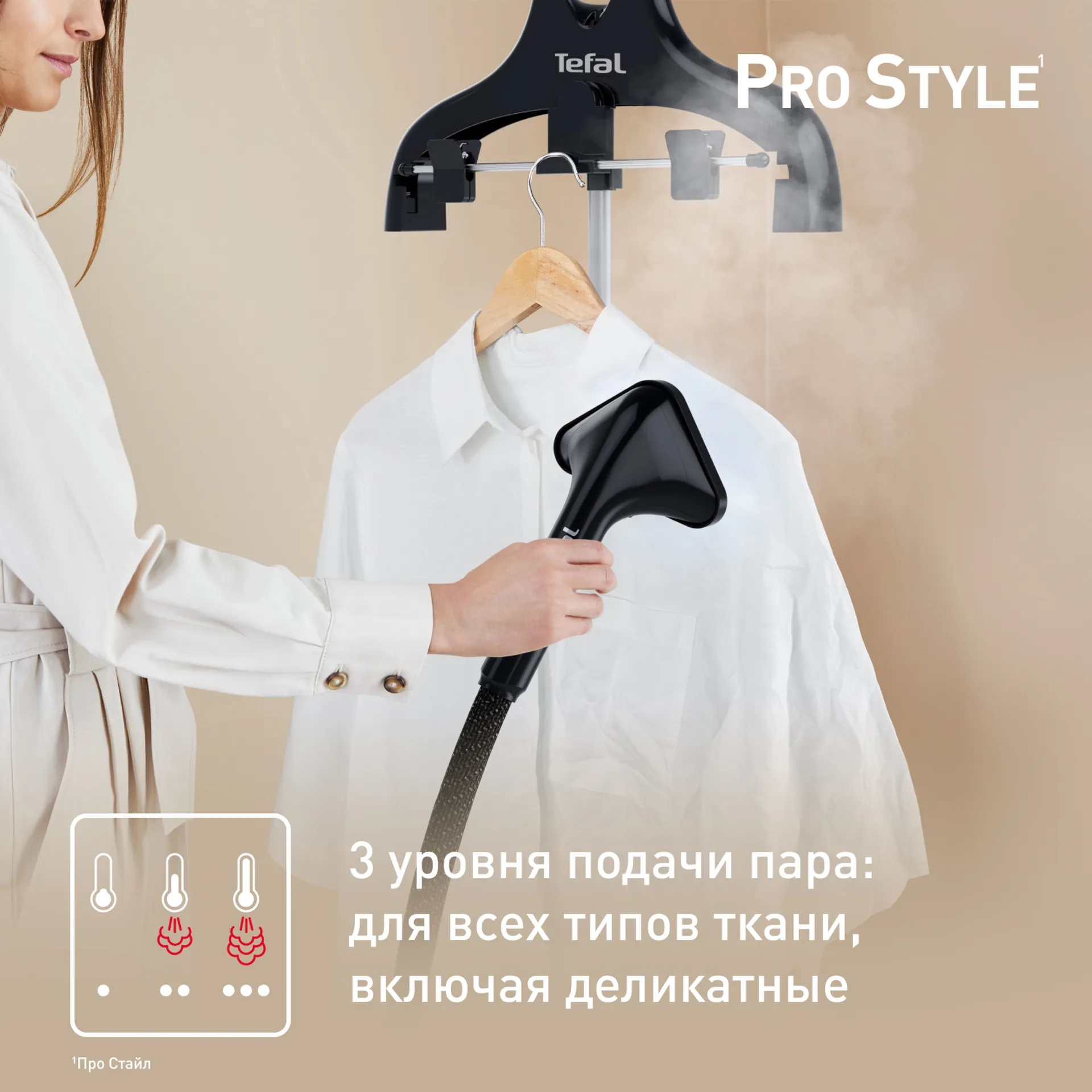 Tefal Pro Style — vertikal bug‘lagich bo‘lib, har qanday matodagi buklamalar va burmalarni tez va xavfsiz tarzda yo‘q qiladi. 42 g/min bug‘ ta’minoti va uchta ish rejimi eng nozik matolar uchun ham optimal sozlamalarni tanlash imkonini beradi.