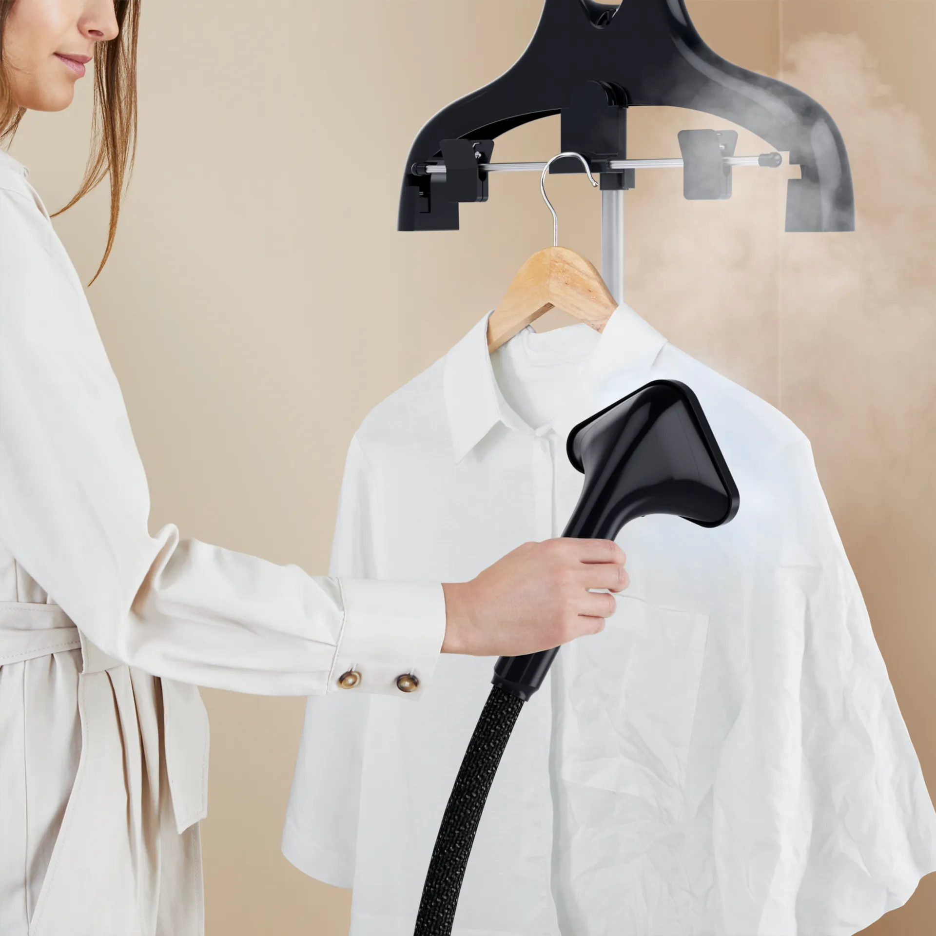 Issiq bug‘ nafaqat kiyimni tekislaydi, balki matoni dezinfeksiya qiladi, noo‘rin hidlarni yo‘q qiladi va kiyimni yangilaydi. Siz bir vaqtning o‘zida bug‘lash va kiyimni yangilash imkoniga ega bo‘lasiz, shuningdek gigiyena ta’minlanadi.