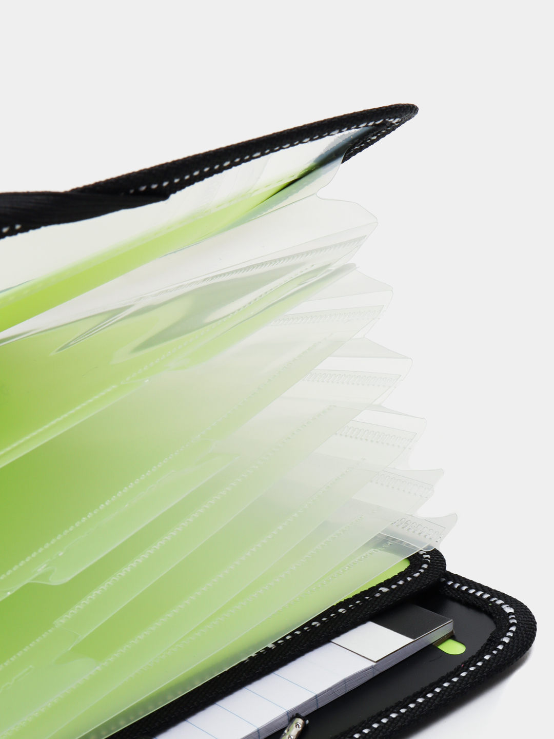 Bo‘limlar soni: 7 ta (vizitka va daftar uchun cho‘ntaklar bilan)