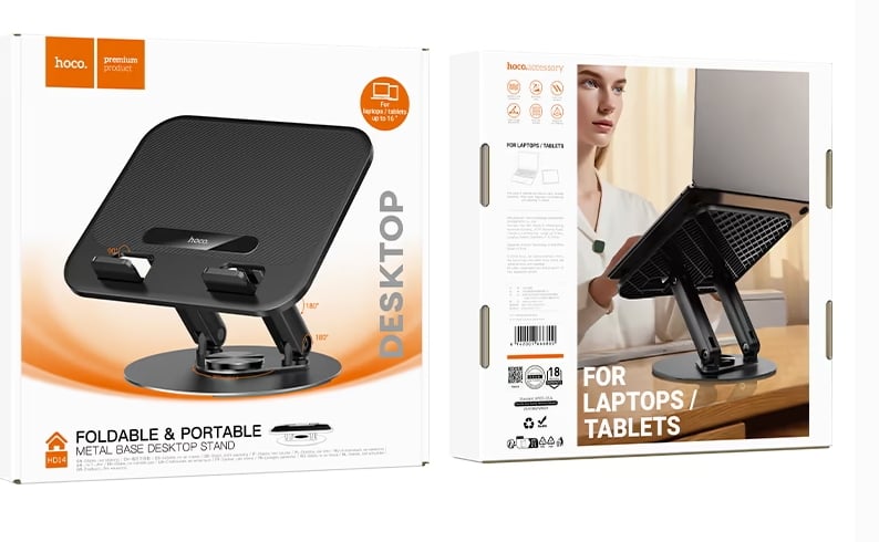 Hoco HD14 Hope — 16 dyuymgacha bo‘lgan noutbuk va planshetlar uchun mo‘ljallangan, buklanadigan va 360° ga aylanuvchi stol usti ushlagich. Metall asos qurilmaning barqaror turishini ta’minlaydi va kundalik foydalanishda ishonchlilikni kafolatlaydi.