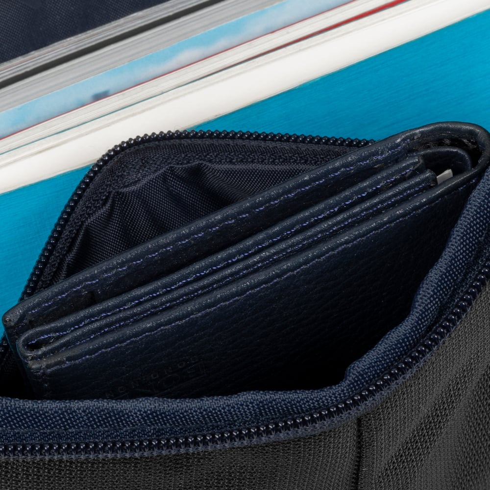 • Ikki old cho‘ntak: biri fermuarga ega, ikkinchisi organayzer paneli bilan vizitkalar, aksessuarlar va smartfon uchun.