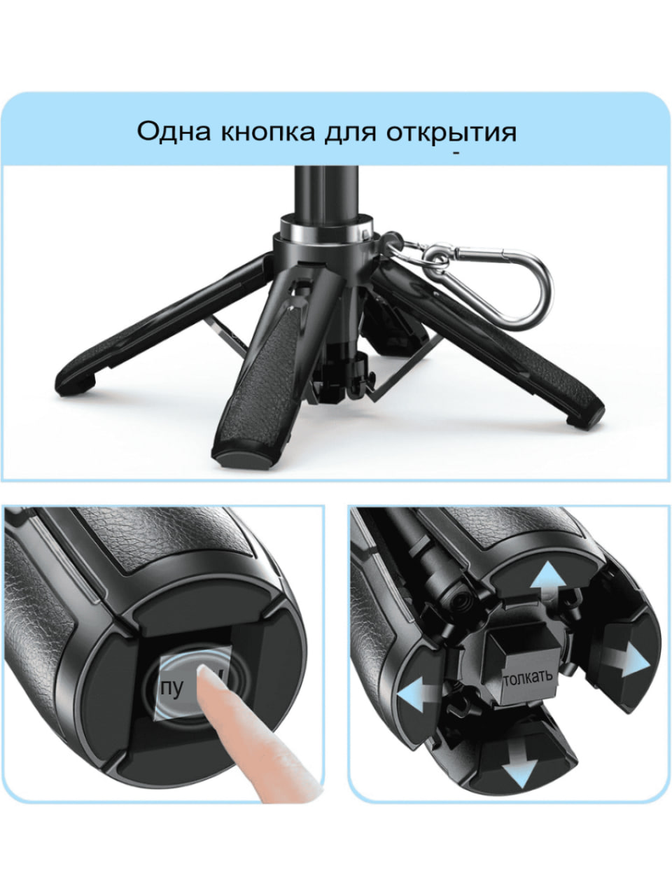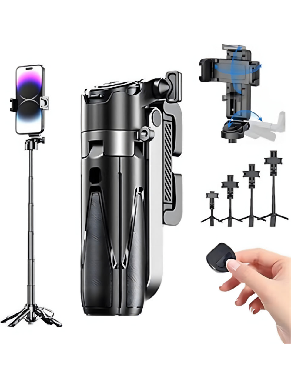 3-in-1 funksionallik — selfi tayoq sifatida foydalaning, stativga aylantiring yoki masofadan boshqaruv tugmasi orqali rasm va video yarating.