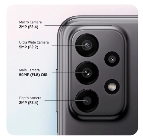 50 Mp asosiy kamera bilan barcha tafsilotlarda qimmatli daqiqalarni suratga oling. Ultra keng kamera bilan ko'rish burchagini kengaytiring. Chuqurlik sensori kamerasi fokusni sozlashda yordam beradi va so'l ob'ektiv hamma narsani eng kichik tafsilotlarigacha suratga oladi.inson ko'ziga o'xshab, 5 megapikselli Ultra keng kamera 123 daraja ko'rish burchagini ta'minlaydi va suratlaringizga chuqurroq nuqtai nazar beradi.2 megapikselli so'l optikasi tufayli barcha yorqin tafsilotlarni yaqindan suratga oling. Bokening tabiiy ta'siri tufayli mavzu loyqa fonda yaxshi ajralib turadi.2 Mp chuqurlik sensori bo'lgan kamera fotosuratda maydon chuqurligini o'zgartirishga imkon beradi. Fon xiralashishi bilan mavzuni tanlang va ajoyib portret fotosuratlarini oling. 8 megapikselli old kamera va Bokeh effekti bilan ajoyib selfilarni suratga oling-kamroq fon, ko'proq siz!Ishonchli batareya bilan bir qadam oldinda bo'ling. 5000 ma / soat batareya (standart sig'im) bilan zaryad haqida qayg'urmasdan hamma narsani qiling . 25 vattgacha bo'lgan juda tez zaryadga ega Galaxy A23 hayotning odatiy ritmini saqlashga yordam beradi.Galaxy A23 tez va samarali ishlashi uchun sakkiz yadroli protsessor va 4 GB/6 GB/8 GB gacha operativ xotiraga ega. Va 64 GB/128 GB ichki xotira va 1 TB gacha bo'lgan microSD karta bilan siz ko'proq saqlash joyiga ega bo'lasiz.Quvvat tugmachasiga o'rnatilgan barmoq izi sensori yordamida siz bir marta bosish orqali smartfonni qulfdan chiqarishingiz mumkin.