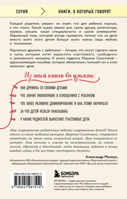Каждый родитель уверен: он знает, что для ребенка хорошо, а что плохо. Какой нужен режим дня, какие друзья, репетиторы, кружки, секции, какая специальность и какой университет. Идеальный план, который всегда срывается, потому что на деле вместо всего этого детям больше всего нужны любовь и понимание. Научиться дружить с ребенком - лучшее, что могут сделать мамы и папы, которые хотят вырастить счастливого, свободного и увлеченного человека. А книга педагога Марины Солотовой - вдохновляющее пособие, которое обязательно поможет им в этом нелегком деле.